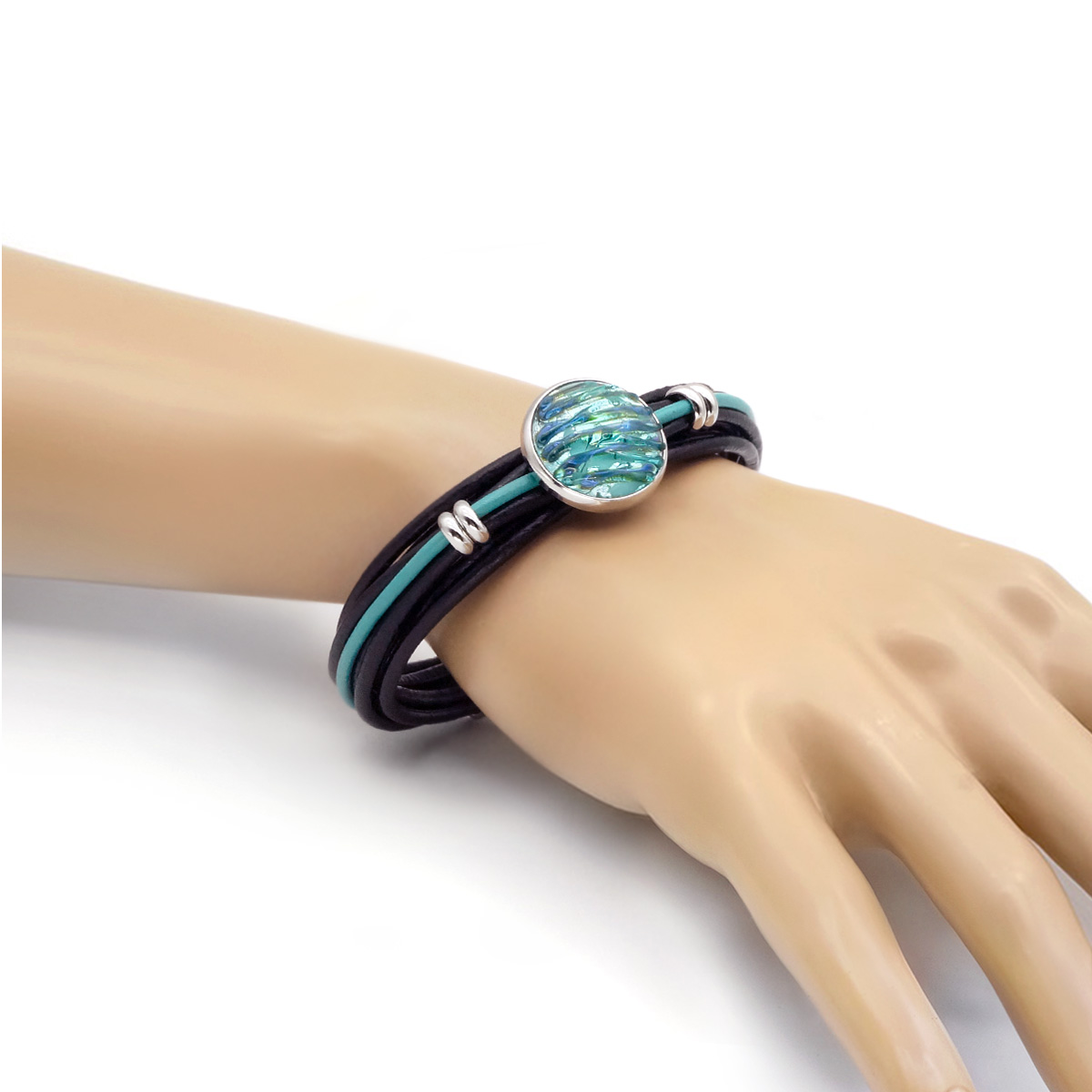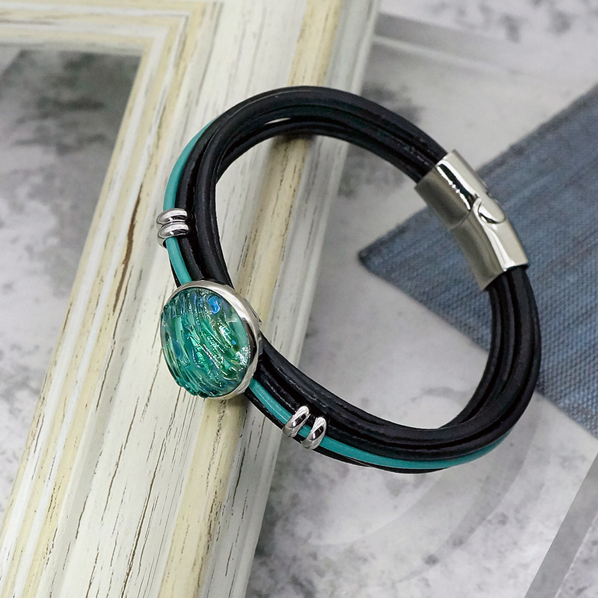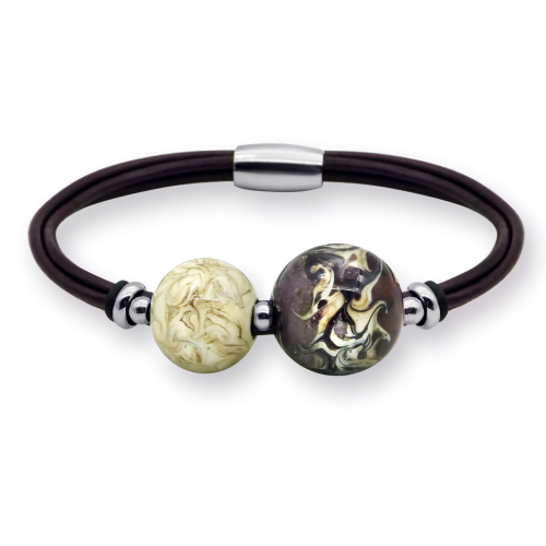 Браслет изготовлен из муранского стекла, натуральной кожи и гипоаллергенной ювелирной стали, что очень важно для людей с чувствительной кожей. Металл не темнеет и не подвергается воздействиям окружающей среды, надолго обеспечивая красивый внешний вид изделия. Крепкий магнитный замок надежно фиксируется на запястье. Ширина браслета - 1 см. Диаметр стеклянного элемента - 2 см. Вес - 22 гр.