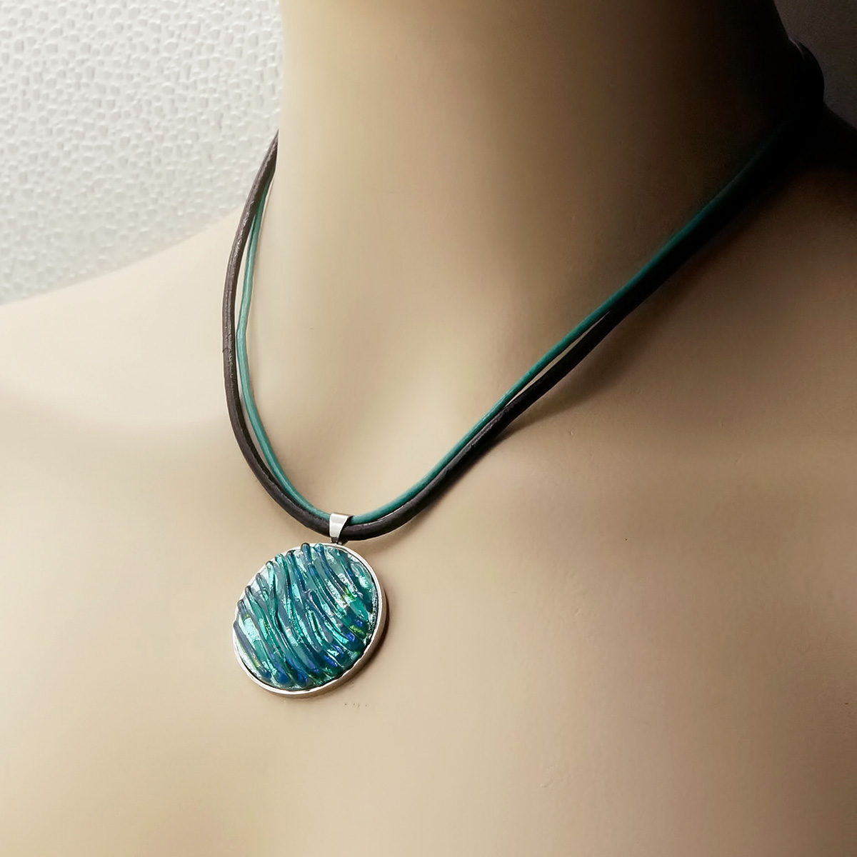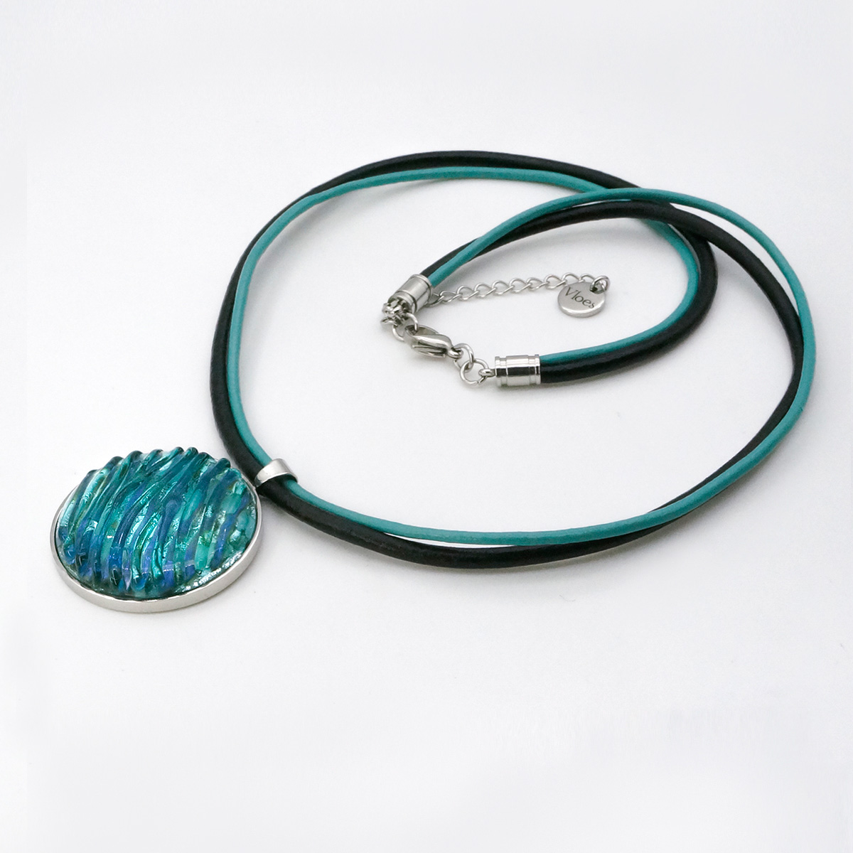 Колье изготовлено из натуральной кожи, муранского стекла и гипоаллергенной ювелирной стали, что очень важно для людей с чувствительной кожей. Металл не темнеет и не подвергается воздействиям окружающей среды, надолго обеспечивая красивый внешний вид изделия. Длина колье - 46 см + 5 см. удлиняющая цепочка. Диаметр стеклянного элемента - 3 см. Вес - 25 гр.