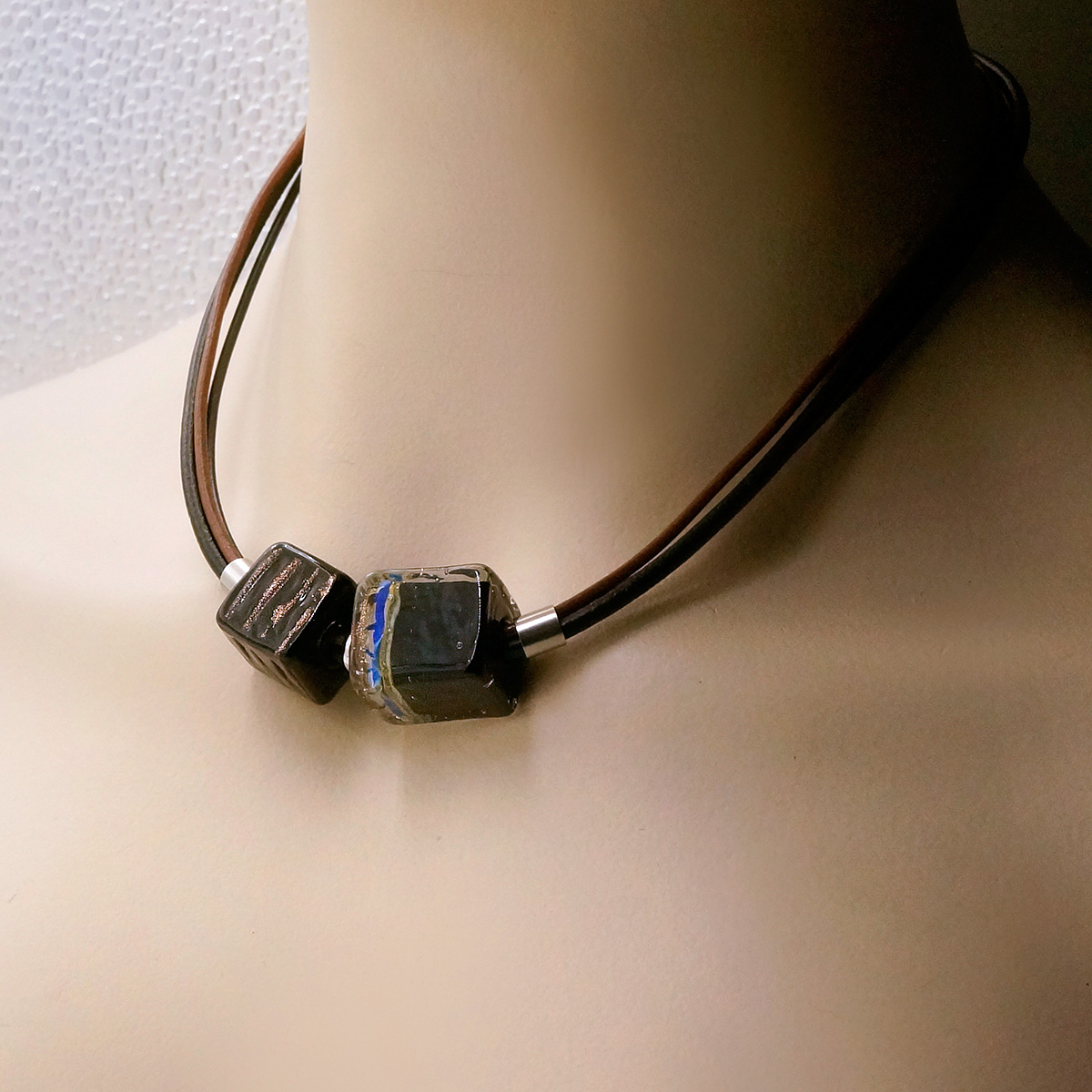 Колье изготовлено из натуральной кожи, муранского стекла и гипоаллергенной ювелирной стали, что очень важно для людей с чувствительной кожей. Металл не темнеет и не подвергается воздействиям окружающей среды, надолго обеспечивая красивый внешний вид изделия. Длина колье - 46 см + 5 см. удлиняющая цепочка. Размер стеклянных бусин - 2х2 и 1,5х1,5 см. Вес - 34 гр.