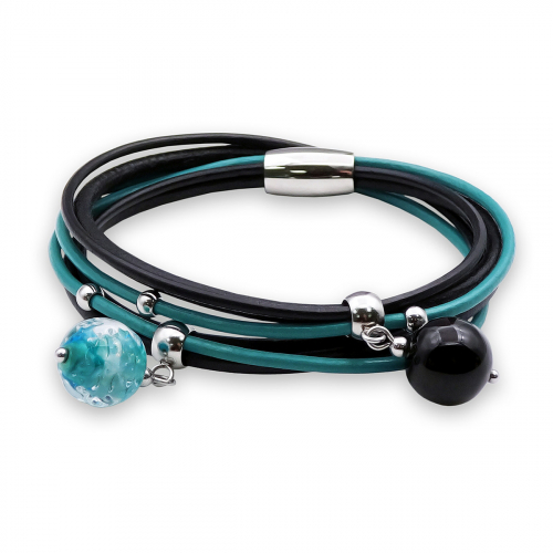 Браслет изготовлен из муранского стекла, натуральной кожи и гипоаллергенной ювелирной стали, что очень важно для людей с чувствительной кожей. Металл не темнеет и не подвергается воздействиям окружающей среды, надолго обеспечивая красивый внешний вид изделия. Крепкий магнитный замок надежно фиксируется на запястье. Ширина браслета - 1 см. Диаметр стеклянных шариков - 1,2 см. Вес - 18 гр.