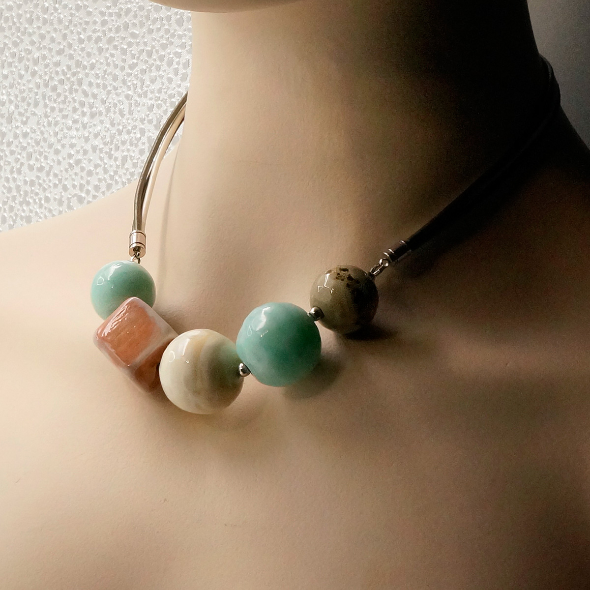 Колье изготовлено из натуральной кожи, муранского стекла и гипоаллергенной ювелирной стали, что очень важно для людей с чувствительной кожей. Металл не темнеет и не подвергается воздействиям окружающей среды, надолго обеспечивая красивый внешний вид изделия. Длина колье - 46 см + 5 см. удлиняющая цепочка. Диаметр стеклянных шаров - 1,8, 2,2 и 2,3 см. Куб - 1,8х2 см. Вес - 67 гр.
