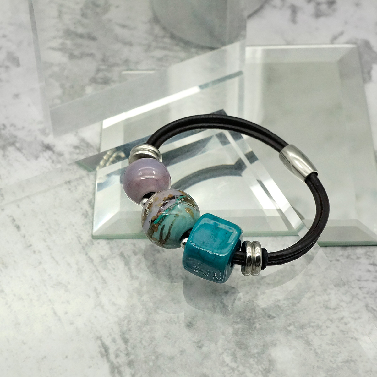 Браслет изготовлен из муранского стекла, натуральной кожи и гипоаллергенной ювелирной стали, что очень важно для людей с чувствительной кожей. Металл не темнеет и не подвергается воздействиям окружающей среды, надолго обеспечивая красивый внешний вид изделия. Крепкий магнитный замок надежно фиксируется на запястье. Ширина браслета - 0,5 см. Размер стеклянного куба - 1,5*1,5 см. Диаметр шаров - 1,5 и 1,2 см. Вес - 32 гр.