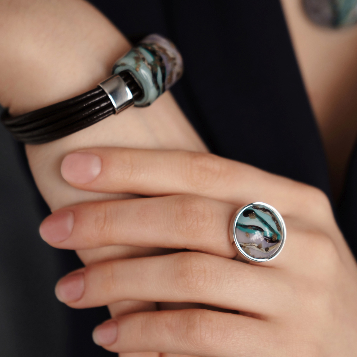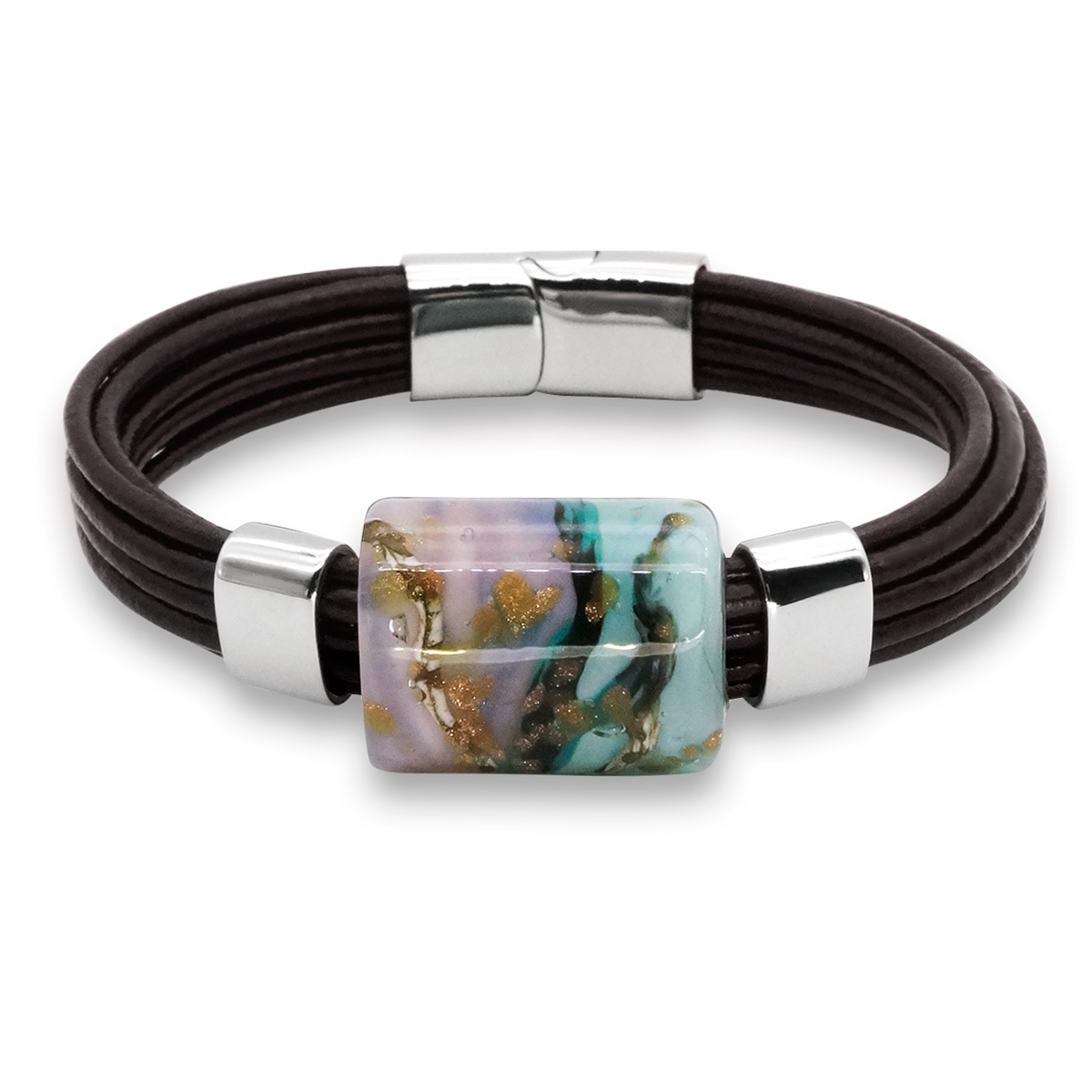 Браслет изготовлен из муранского стекла, натуральной кожи и гипоаллергенной ювелирной стали, что очень важно для людей с чувствительной кожей. Металл не темнеет и не подвергается воздействиям окружающей среды, надолго обеспечивая красивый внешний вид изделия. Крепкий магнитный замок с двойной защитой надежно фиксируется на запястье. Ширина браслета - 1,5 см. Размер стеклянной бусины - 1,9*2,5 см. Вес - 30 гр.