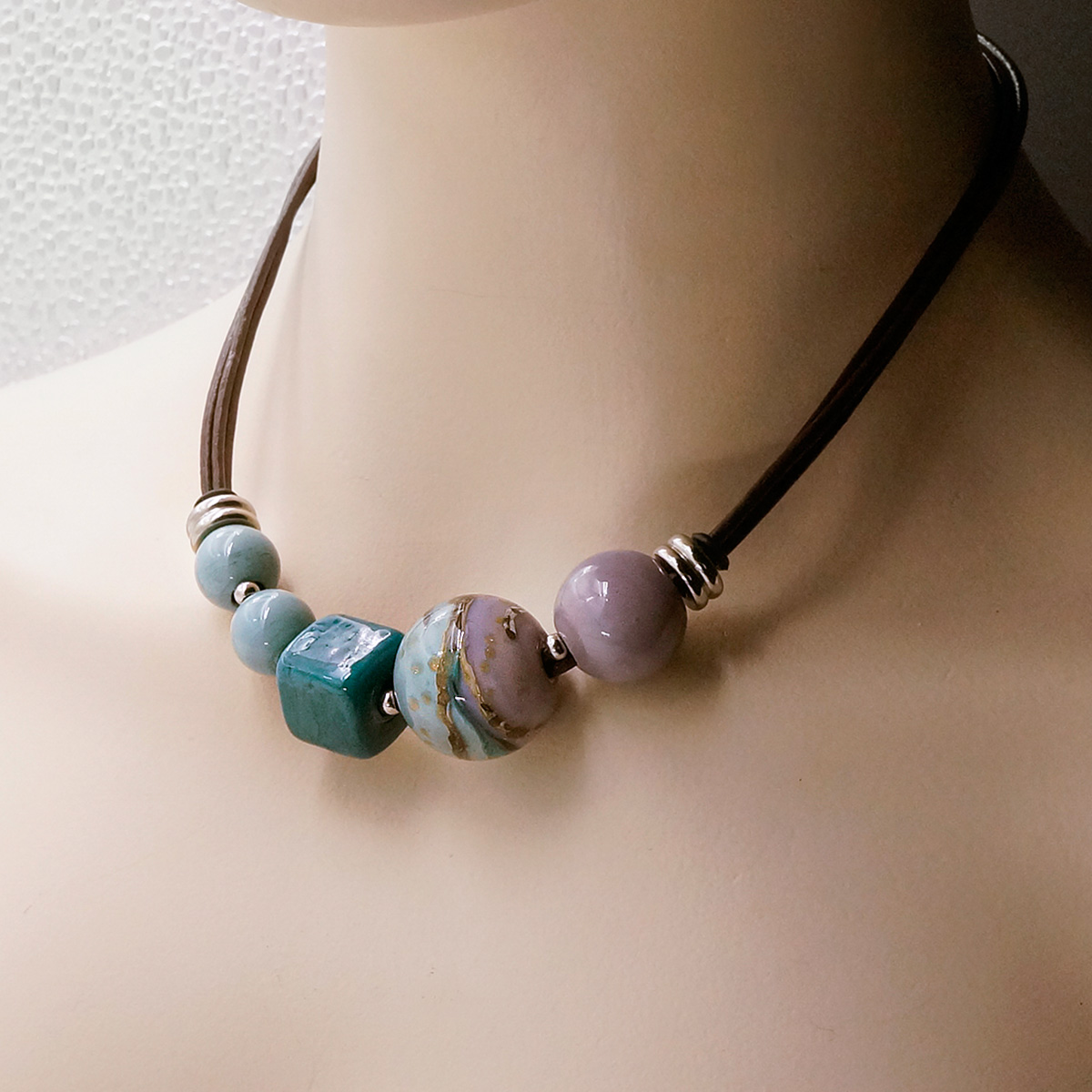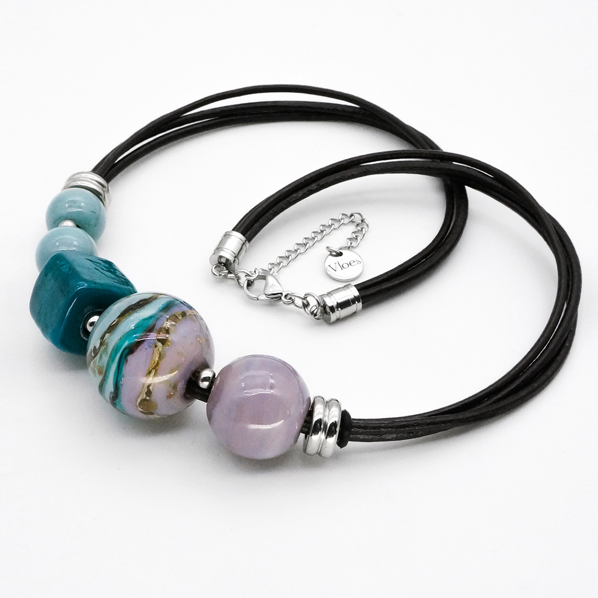 Колье изготовлено из натуральной кожи, муранского стекла и гипоаллергенной ювелирной стали, что очень важно для людей с чувствительной кожей. Металл не темнеет и не подвергается воздействиям окружающей среды, надолго обеспечивая красивый внешний вид изделия. Длина колье - 46 см + 5 см. удлиняющая цепочка. Диаметр стеклянных шаров - 1,2; 1,8 и 2 см. Размер стеклянного куба - 1,5х1,5 см. Вес - 51 гр.