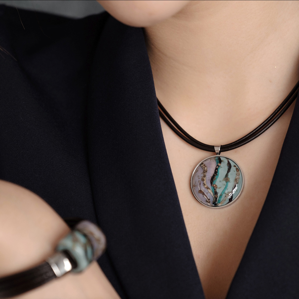 Колье изготовлено из натуральной кожи, муранского стекла и гипоаллергенной ювелирной стали, что очень важно для людей с чувствительной кожей. Металл не темнеет и не подвергается воздействиям окружающей среды, надолго обеспечивая красивый внешний вид изделия. Длина колье - 46 см + 5 см. удлиняющая цепочка. Диаметр стеклянного элемента - 3 см. Вес - 23 гр.