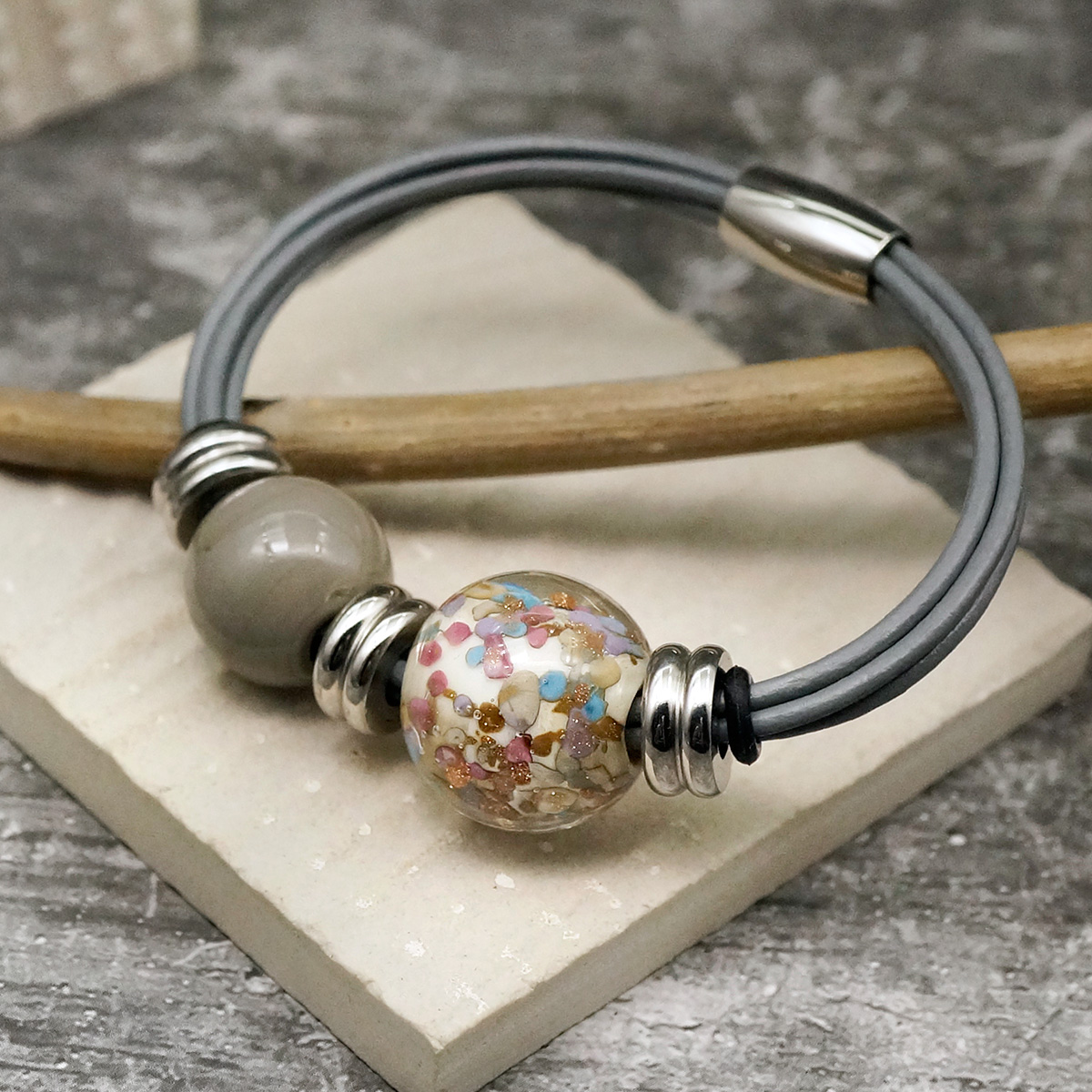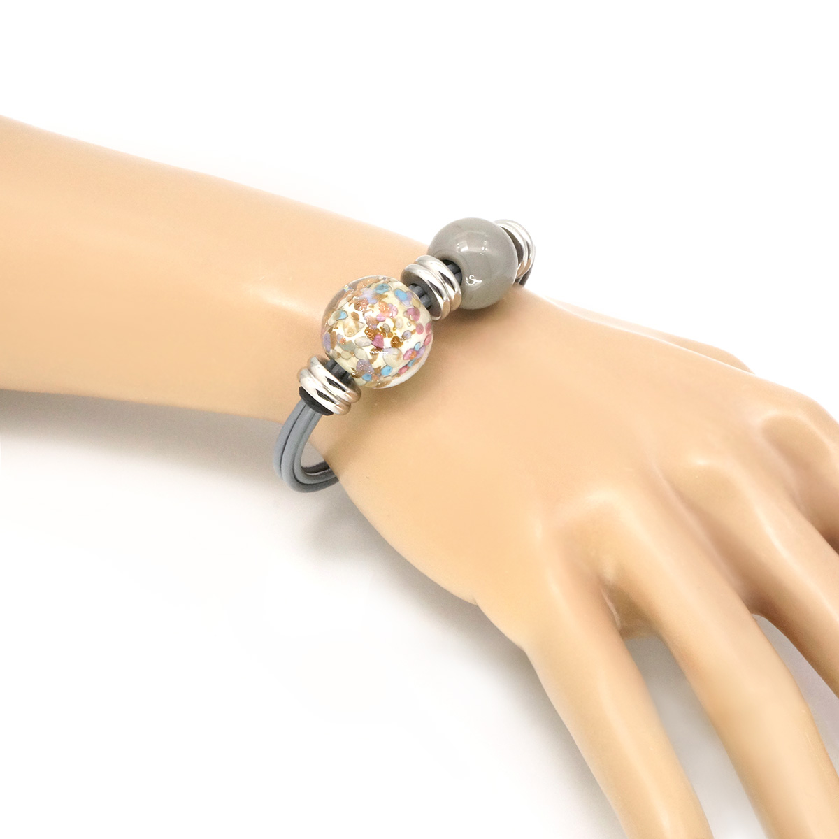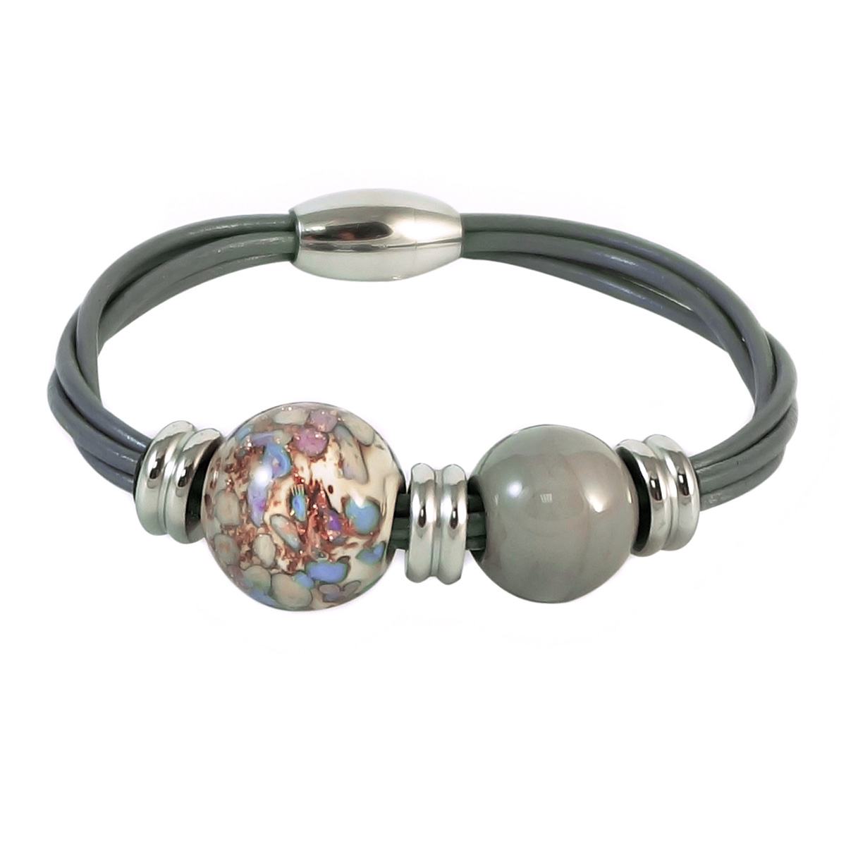 Браслет изготовлен из муранского стекла, натуральной кожи и гипоаллергенной ювелирной стали, что очень важно для людей с чувствительной кожей. Металл не темнеет и не подвергается воздействиям окружающей среды, надолго обеспечивая красивый внешний вид изделия. Крепкий магнитный замок надежно фиксируется на запястье. Ширина браслета - 0,5 см. Диаметр стеклянных шариков - 1,5 и 1,8 см. Вес - 25 гр.
