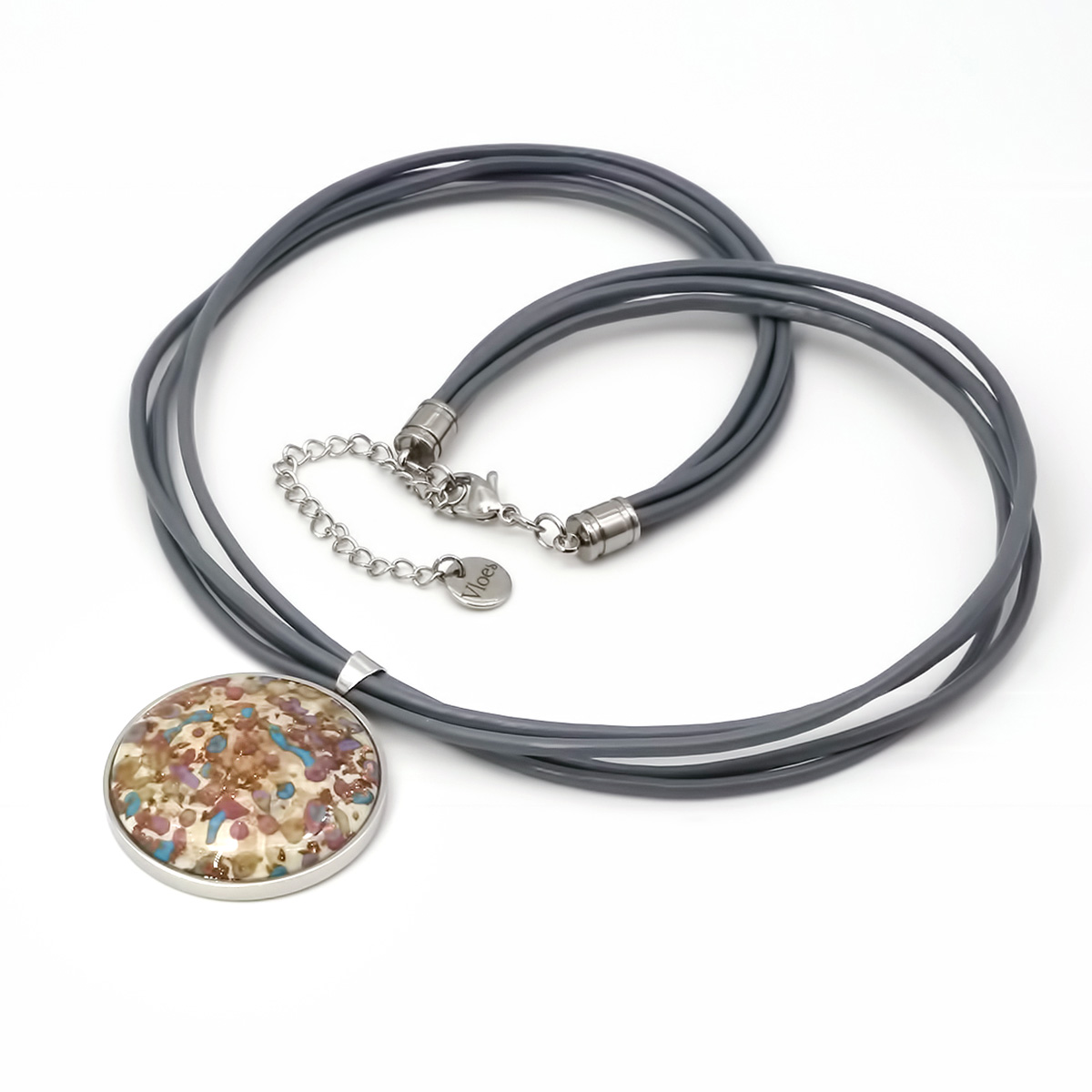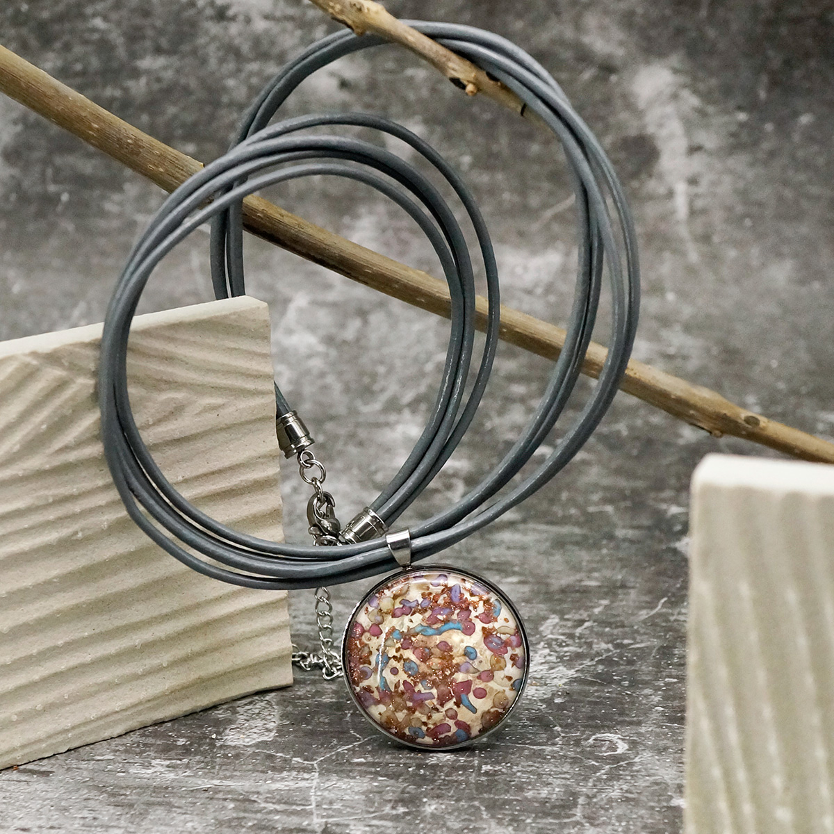 Колье изготовлено из натуральной кожи, муранского стекла и гипоаллергенной ювелирной стали, что очень важно для людей с чувствительной кожей. Металл не темнеет и не подвергается воздействиям окружающей среды, надолго обеспечивая красивый внешний вид изделия. Длина колье - 46 см + 5 см. удлиняющая цепочка. Диаметр стеклянного элемента - 3 см. Вес - 23 гр.