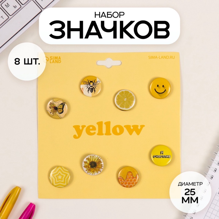 Набор значков на одежду, рюкзак, сумку «Жёлтые», 8 шт., d=25 мм, закатные, 16.5×17 см