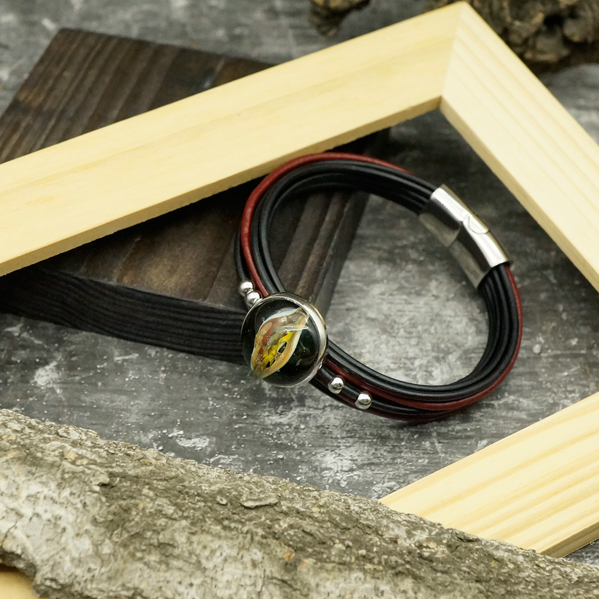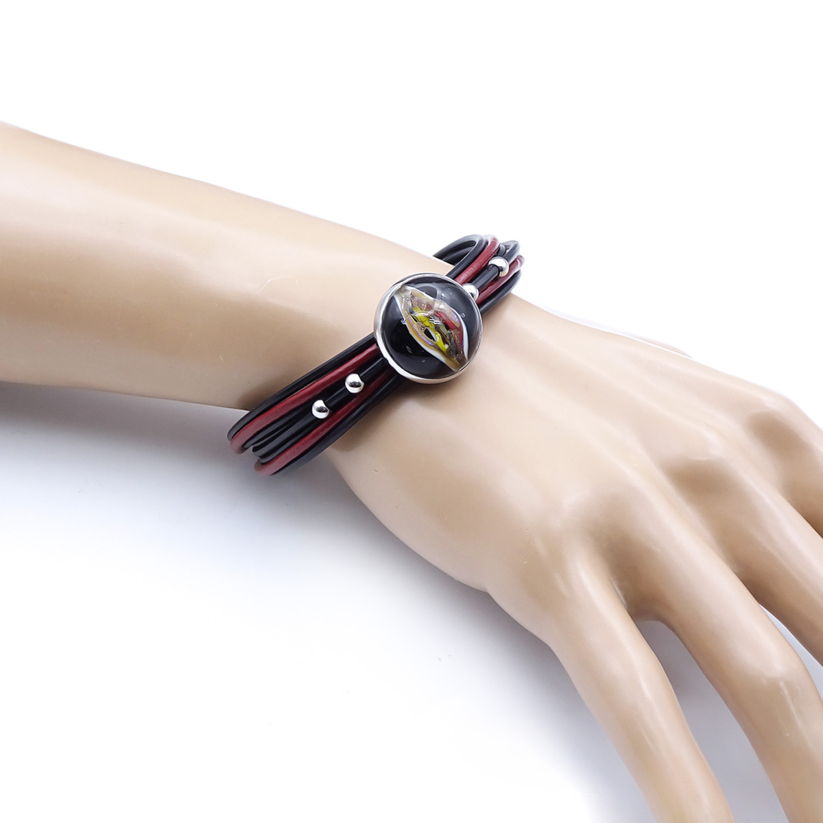 Браслет изготовлен из муранского стекла, натуральной кожи и гипоаллергенной ювелирной стали, что очень важно для людей с чувствительной кожей. Металл не темнеет и не подвергается воздействиям окружающей среды, надолго обеспечивая красивый внешний вид изделия. Крепкий магнитный замок с двойной защитой надежно фиксируется на запястье. Ширина браслета - 1,5 см. Диаметр стеклянного элемента - 2 см. Вес - 22 гр.