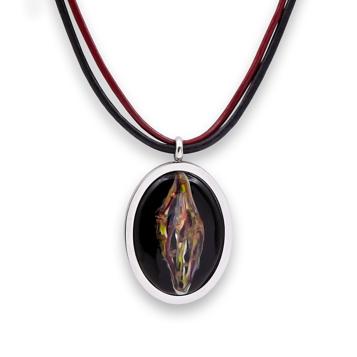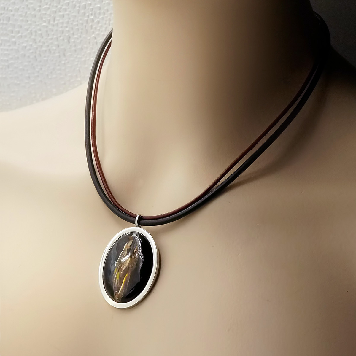 Колье изготовлено из натуральной кожи, муранского стекла и гипоаллергенной ювелирной стали, что очень важно для людей с чувствительной кожей. Металл не темнеет и не подвергается воздействиям окружающей среды, надолго обеспечивая красивый внешний вид изделия. Длина колье - 46 см + 5 см. удлиняющая цепочка. Размер стеклянного элемента - 4х3 см. Вес - 24 гр.