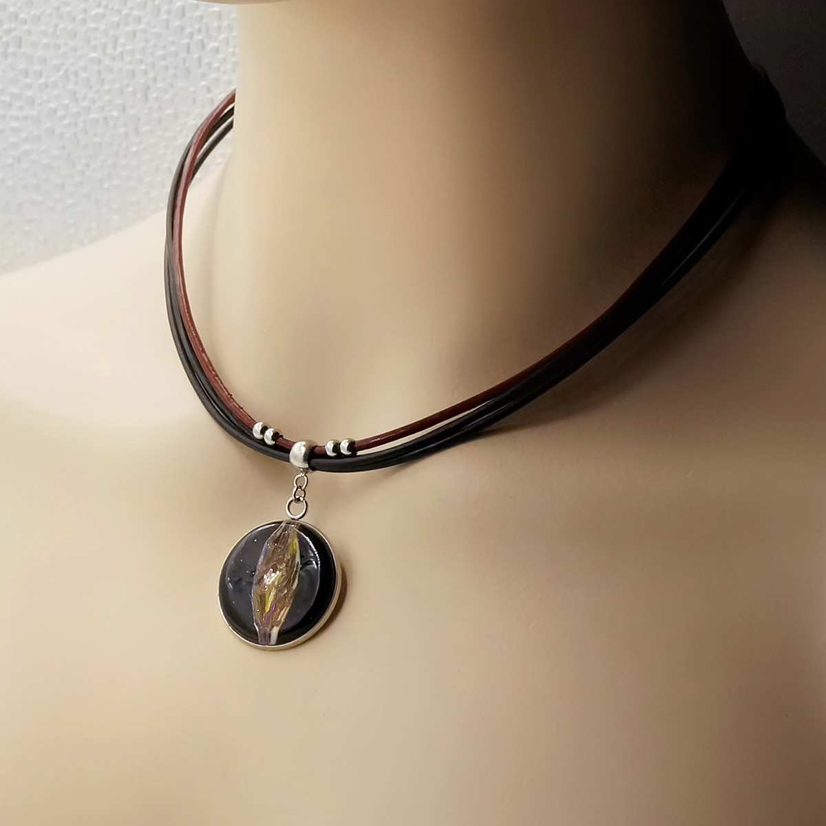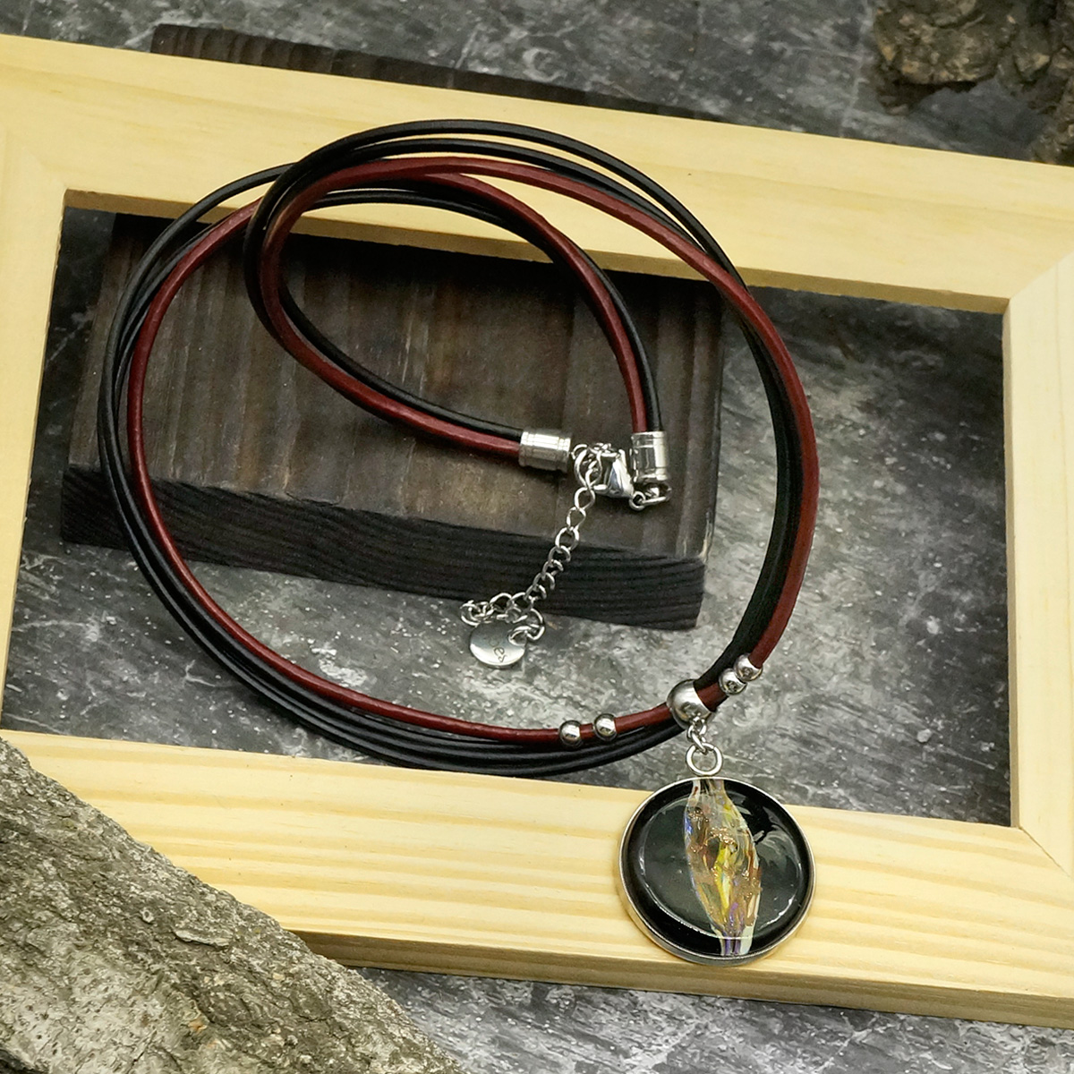 Колье изготовлено из натуральной кожи, муранского стекла и гипоаллергенной ювелирной стали, что очень важно для людей с чувствительной кожей. Металл не темнеет и не подвергается воздействиям окружающей среды, надолго обеспечивая красивый внешний вид изделия. Длина колье - 46 см + 5 см. удлиняющая цепочка. Диаметр стеклянного элемента - 2,5 см. Вес - 17 гр.