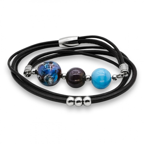 Браслет изготовлен из муранского стекла, натуральной кожи и гипоаллергенной ювелирной стали, что очень важно для людей с чувствительной кожей. Металл не темнеет и не подвергается воздействиям окружающей среды, надолго обеспечивая красивый внешний вид изделия. Длина подвески 3,5 см. Размер стеклянной бусины - 1 см. Вес - 28 гр.