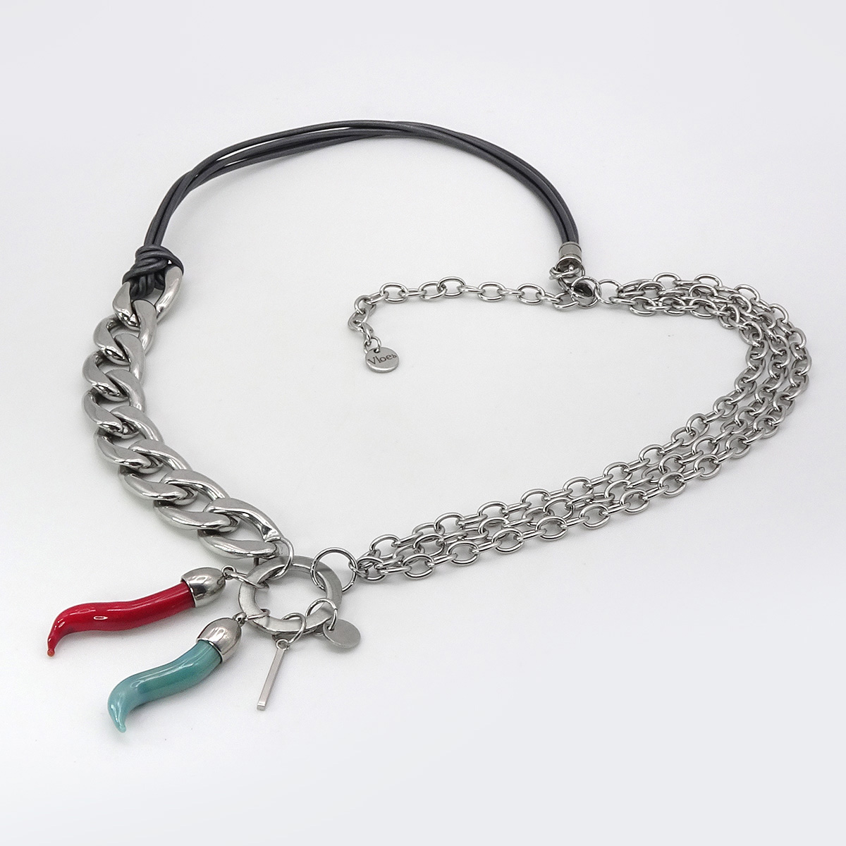 Колье изготовлено из натуральной кожи, муранского стекла и гипоаллергенной ювелирной стали, что очень важно для людей с чувствительной кожей. Металл не темнеет и не подвергается воздействиям окружающей среды, надолго обеспечивая красивый внешний вид изделия. Длина колье - 55 см + 5 см. удлиняющая цепочка. Длина подвески - 3,5 см. Вес - 66 гр.