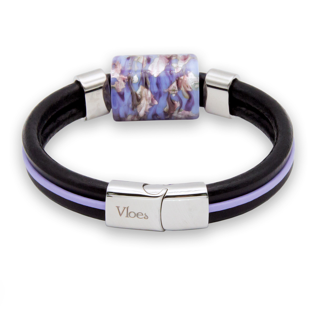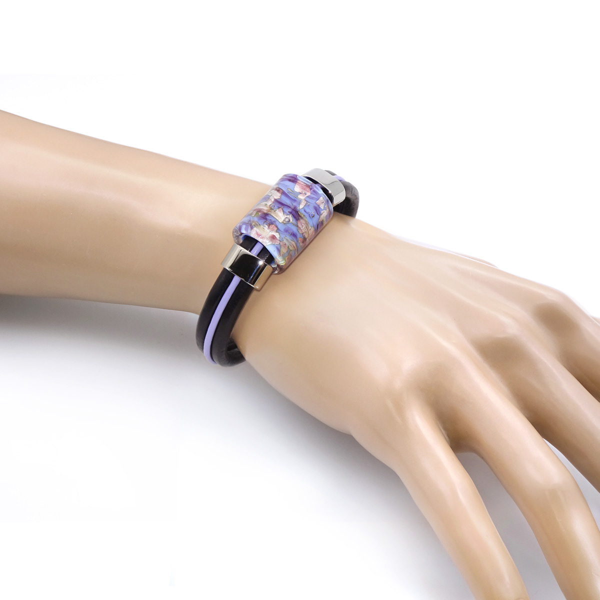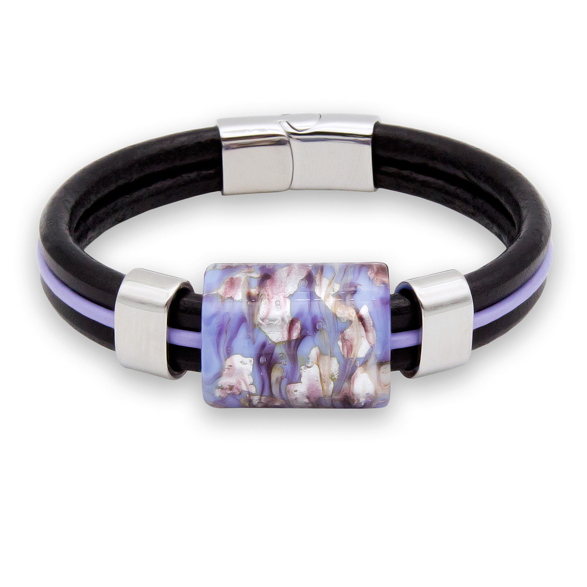 Браслет изготовлен из муранского стекла, натуральной кожи и гипоаллергенной ювелирной стали, что очень важно для людей с чувствительной кожей. Металл не темнеет и не подвергается воздействиям окружающей среды, надолго обеспечивая красивый внешний вид изделия. Крепкий магнитный замок с двойной защитой надежно фиксируется на запястье. Ширина браслета - 1,5 см. Размер стеклянной бусины - 1,9x2,5 см. Вес - 33 гр.