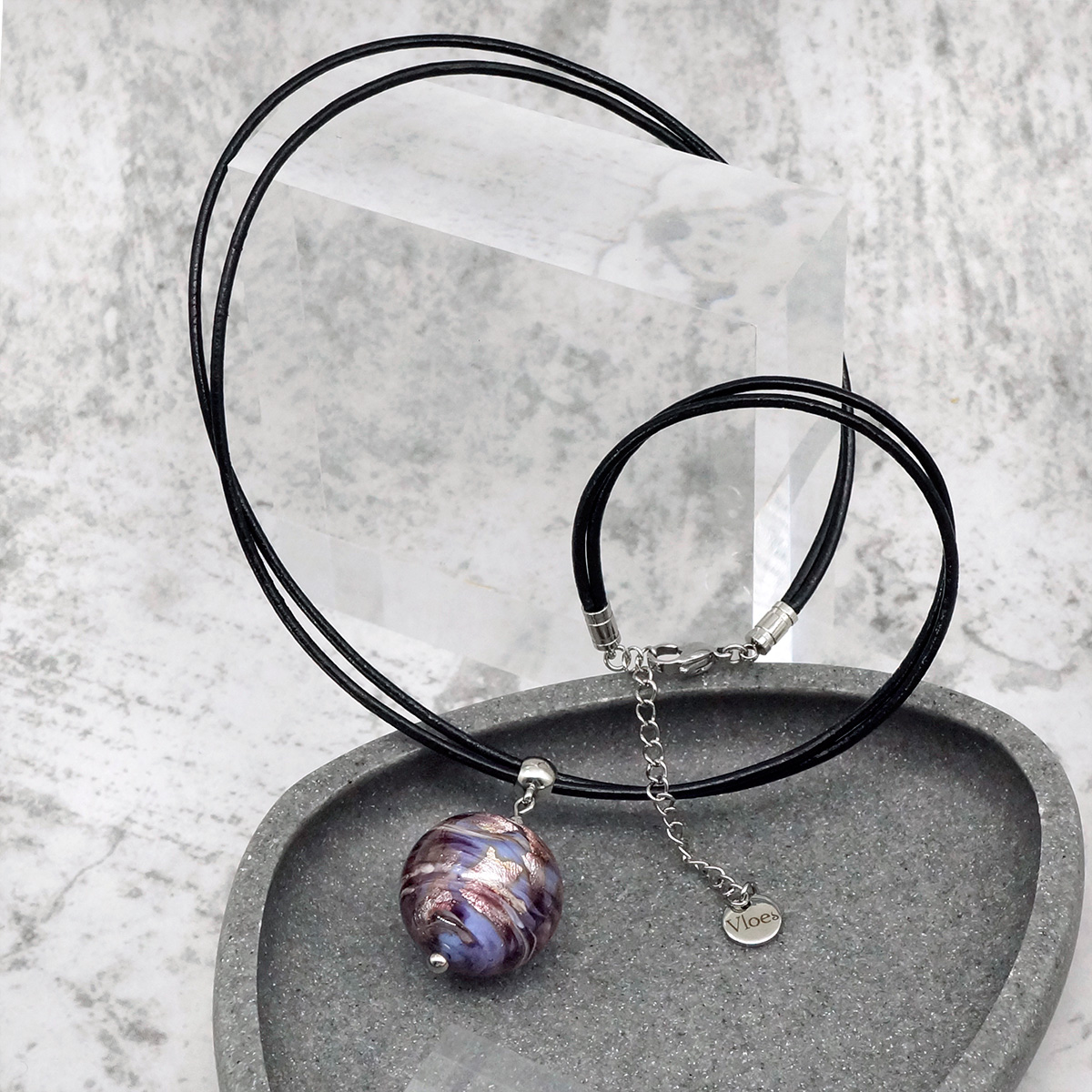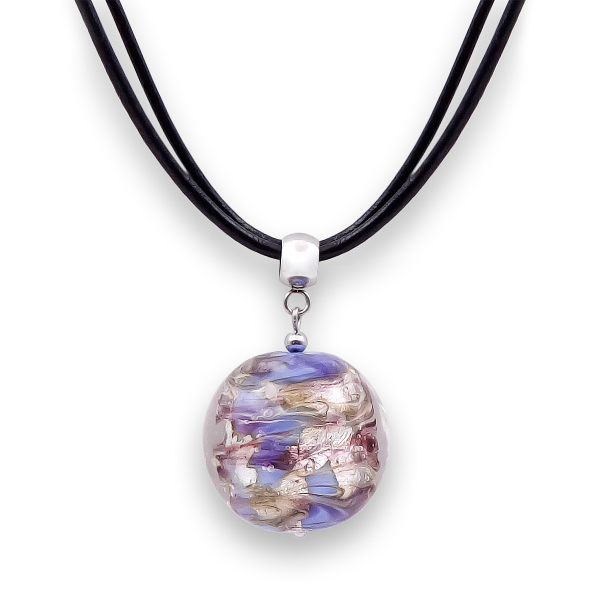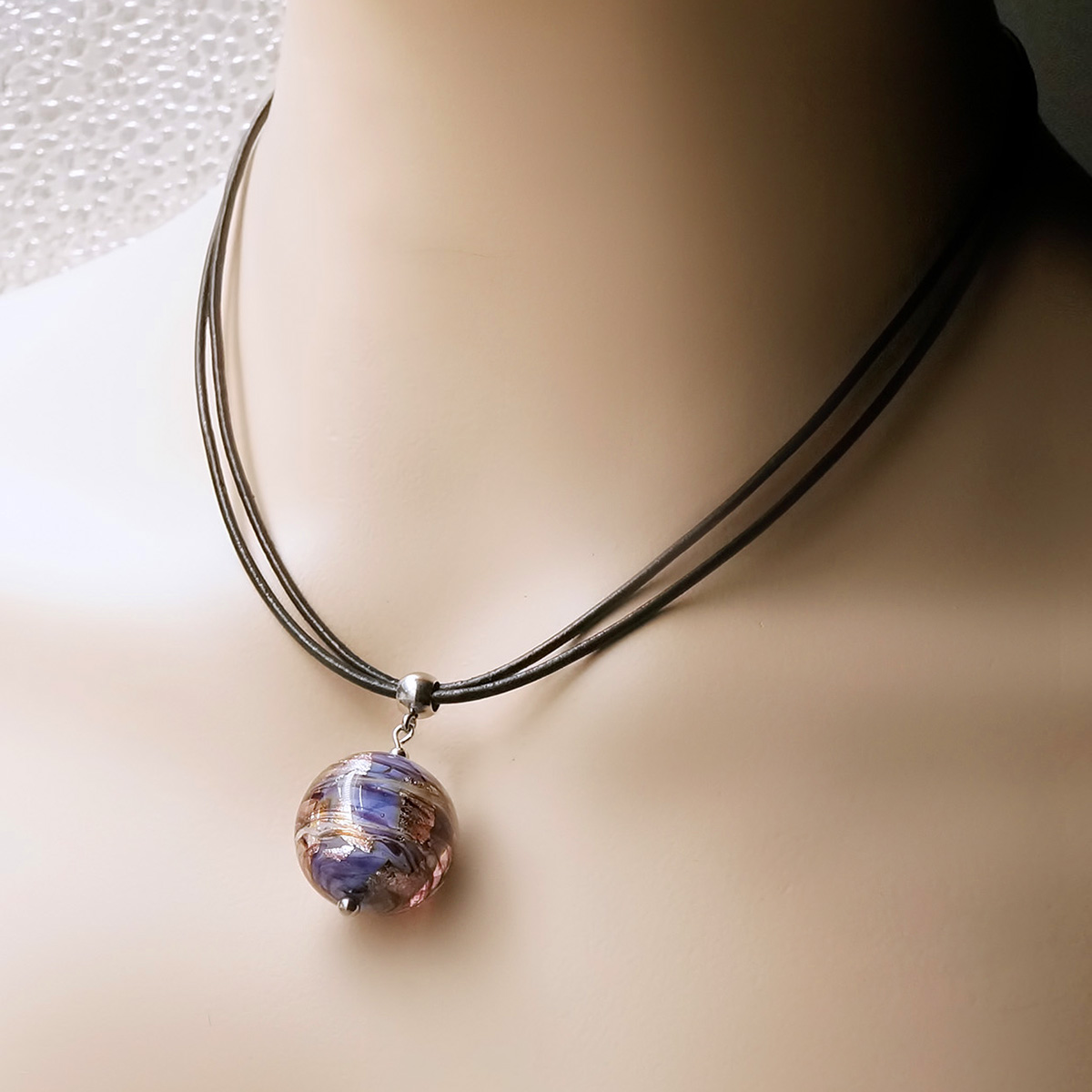 Колье изготовлено из натуральной кожи, муранского стекла и гипоаллергенной ювелирной стали, что очень важно для людей с чувствительной кожей. Металл не темнеет и не подвергается воздействиям окружающей среды, надолго обеспечивая красивый внешний вид изделия. Длина колье - 46 см + 5 см. удлиняющая цепочка. Диаметр стеклянного шара - 2,3 см. Вес - 20 гр.