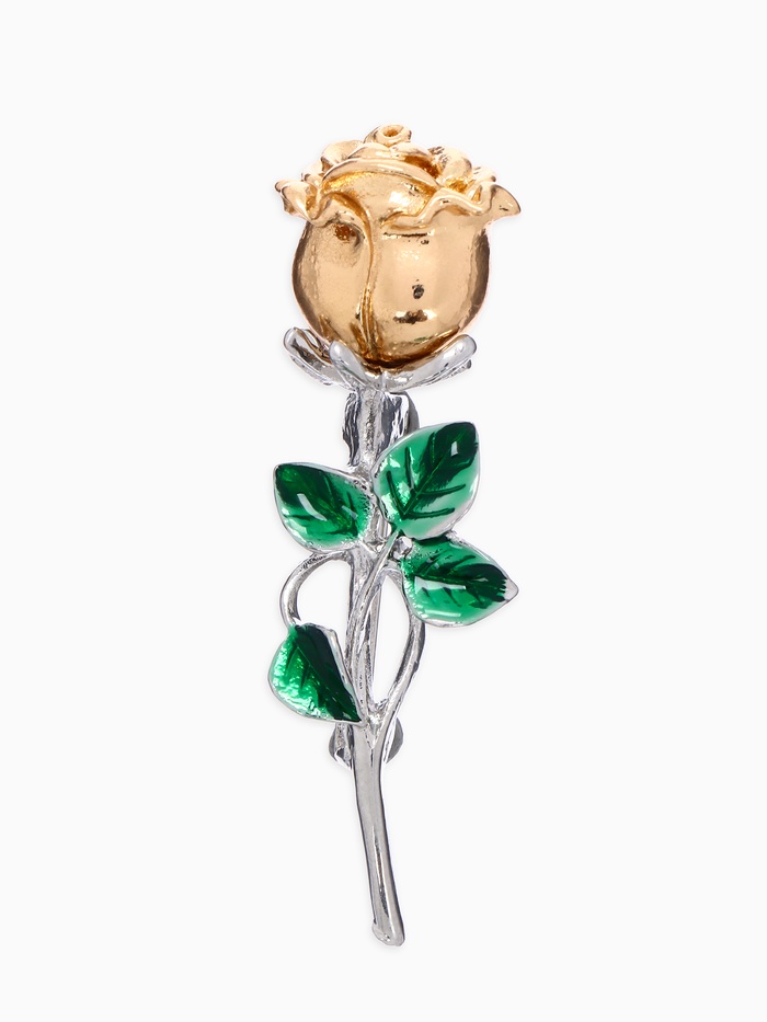 Изысканная брошь длиной 5,5 см воплощает в себе утончённость и природную свежесть, сочетая зелёный цвет эмали с серебряно-золотой фурнитурой. Металлическая основа надёжна и долговечна, а дизайн в виде изящной розы подчёркивает женственность и гармонию образа.