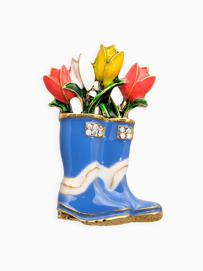 Оцените очарование и свежесть весны с брошь в виде тюльпанов, расположившихся в сапожках, выполненных в разноцветной гамме и оформленных в эффектном черном золоте. Этот уникальный аксессуар, посвященный природе и садоводству, привнесет яркие пятна цвета и хорошего настроения в ваш образ.
