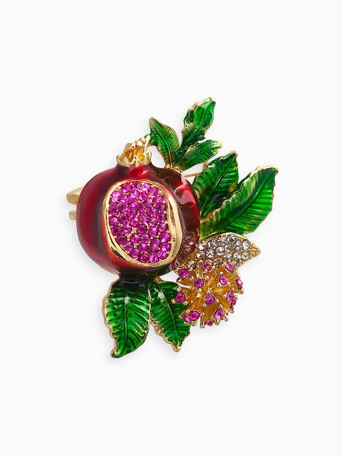 Тщательная проработка деталей подчёркивает высокий уровень исполнения: плавные линии лепестков и сочные оттенки гранатовых зерен создают ощущение живого, натурального мотива. Золотистая фурнитура придаёт изделию благородство и долговечность, а использование эмали и страз гарантирует насыщенность цвета и эффект мерцания при любом освещении.
