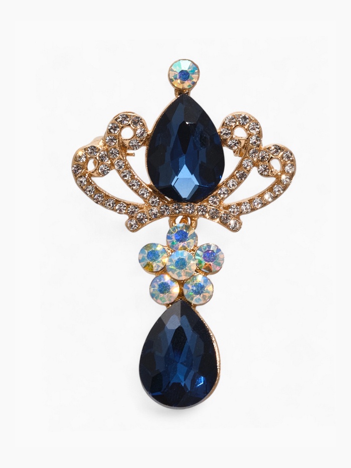 Изготовленная из качественного металла с декоративными вставками из стекла и сверкающих страз, брошь отличается прочностью и долговечностью. Золотистый оттенок фурнитуры придаёт изделию благородство, а подвеска добавляет динамичности и лёгкости в общий образ.