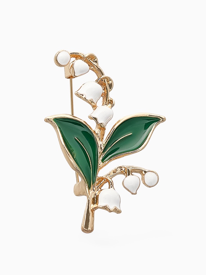 Нежность и свежесть весеннего утра воплощены в изящной броши с двумя веточками ландышей, выполненной в бело-зелёных тонах с золотистым основанием. Её длина в 5,2 см делает украшение заметным, но при этом лёгким и изящным, что позволяет гармонично дополнить любой женский образ.