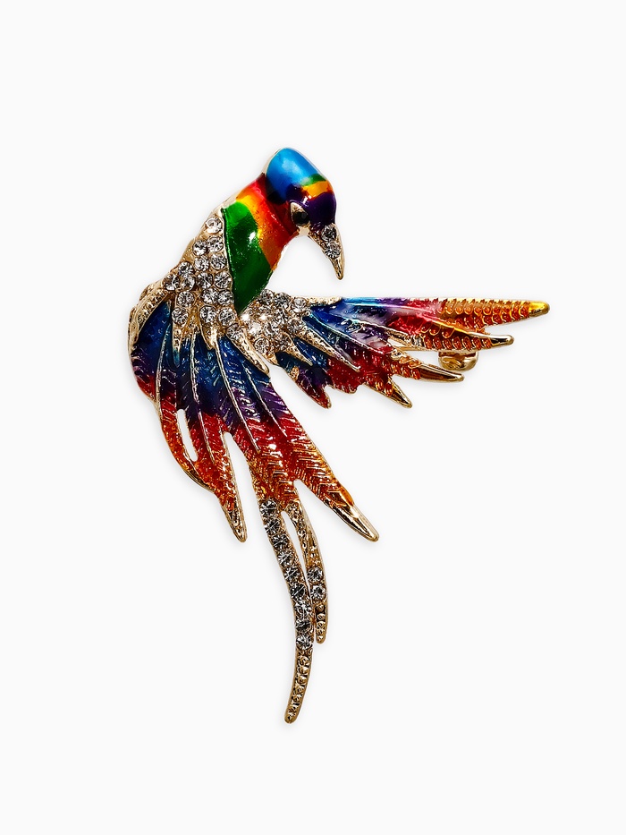 Радужный гость из джунглей Женская брошь с разноцветным попугаем – замечательный аксессуар, придающий вашему образу яркость и энергичность. Аппликация попугая сделана из разноцветной эмали, подчеркивая индивидуальность и страсть к путешествиям.