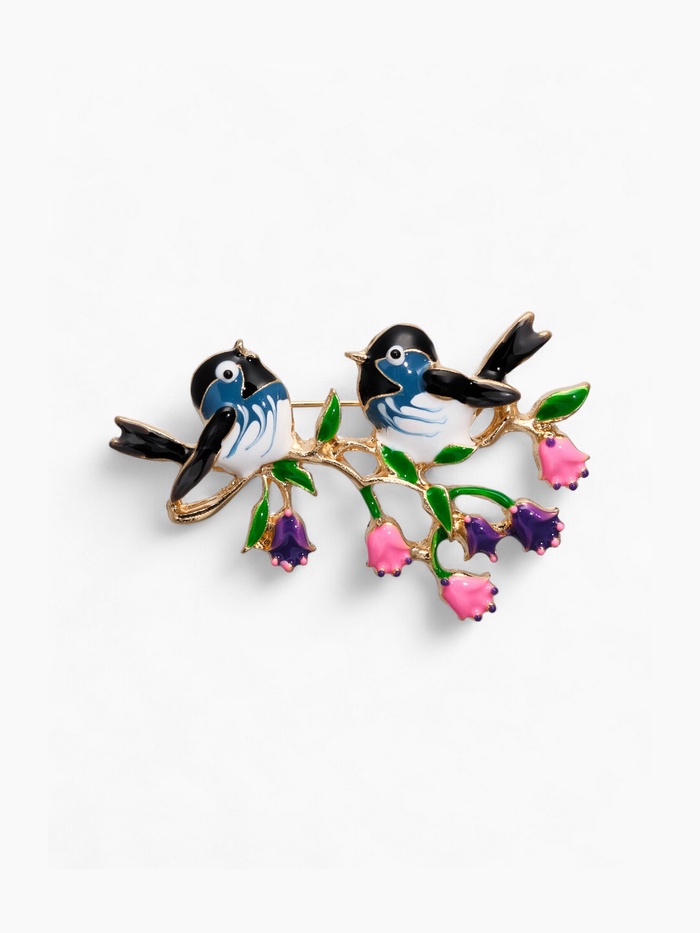 Откройте для себя мир весенних ароматов и радужных красок с брошькой «Птичка на ветке цветка» — небольшим, но выразительным аксессуаром, который украсит любой образ. Две крошечные птички, сидящие на цветущей ветке, выполнены в технике цветной эмали и снабжены элегантной основой из золотистого металла, что делает этот аксессуар подходящим для празднования важных событий, таких как 8 марта, дни рождения и просто подарки любимым женщинам.