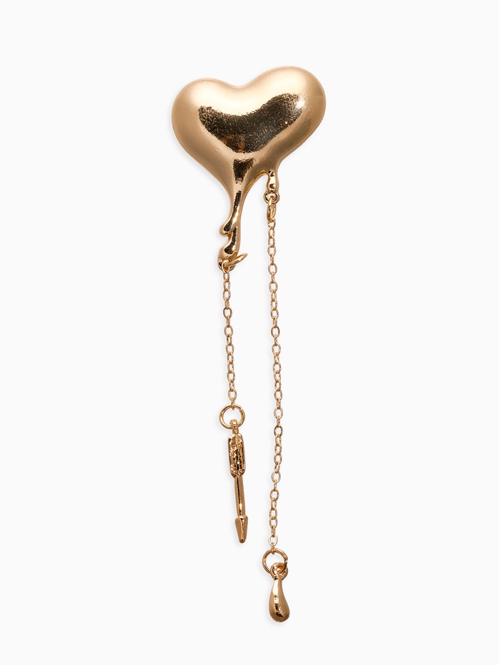 Основой украшения служит качественное металлическое основание, покрытое слоем настоящего золота, которое подчеркивает натуральность и богатство дизайна. Тема минимализма находит отражение в оригинальной концепции «сердце», представленной крупным изображением сердца, окаймленного тонкой цепочкой. Продуманная геометрия изделия помогает сконцентрировать внимание зрителя на основной идее и вызвать восторг и интерес окружающих.