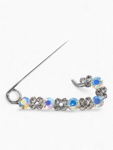 Особое внимание привлекает филигранная отделка булавки стразами, придающими изделию игривый блеск и сияние. Размер 5 сантиметров идеально подходит для крепления к ткани, обеспечивая надежное удержание без риска повредить одежду. Прочный металлический корпус служит гарантией долговечности и качества.