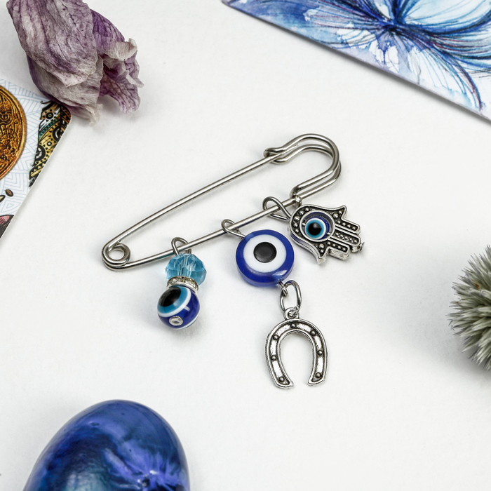 Откройте для себя изысканный аксессуар, который станет не только стильным дополнением вашего образа, но и мощным оберегом — булавку с тремя подвесками в виде руки Хамса и подковы. С длиной 5 см и в элегантном синем цвете с серебряной фурнитурой, она привнесёт нотку утончённости и защиты в повседневную жизнь.