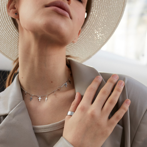 * Современный дизайн: серебристый цвет и стильные крестики делают чокер актуальным для модных трендов 2025 года.