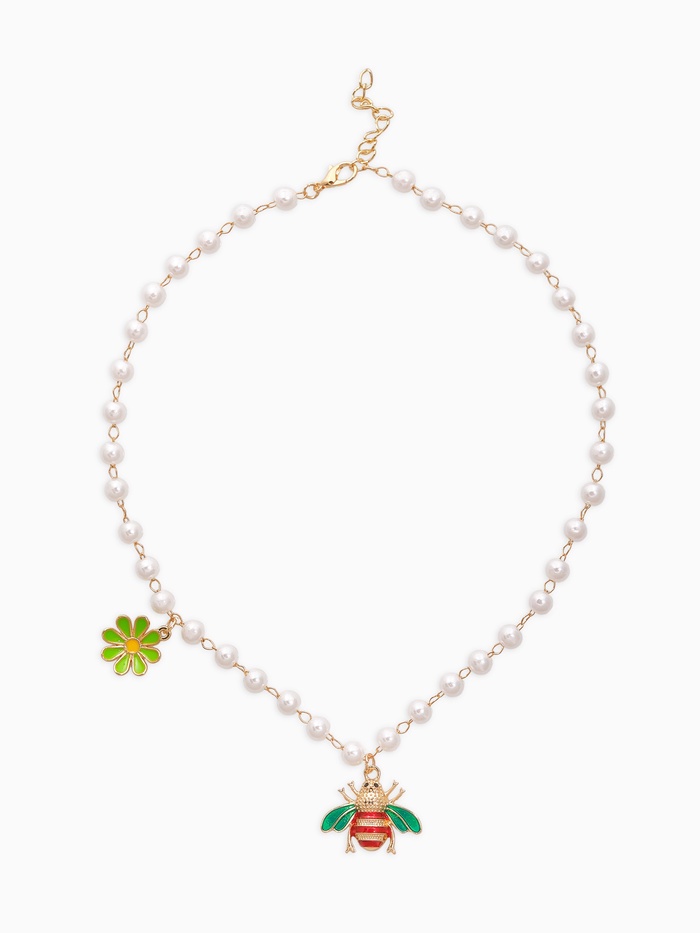 Белоснежные жемчужины на пластиковой основе создают ощущение свежести и чистоты, а металлическая подвеска с тематикой насекомых привносит шарм и оригинальность. Такое колье станет отличным выбором для девочек и женщин, ценящих универсальность и эмоциональную глубину, легко вписываясь в повседневные наряды или праздничные ансамбли.