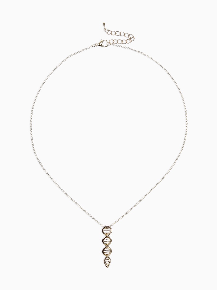 Особенность украшения заключается в тонкой металлической цепи, завершающейся символическим подвесом — миниатюрной молекулой ДНК, выполненной в золотом оттенке. Созданное из высокопрочного металла, изделие отличается долговечностью и износостойкостью, сохраняя первоначальный внешний вид долгие годы.