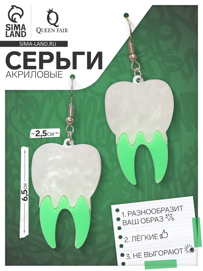 Серьги с акриловыми вставками в виде зубов, погружённых в зелёное зелье, — идеальный аксессуар для тех, кто ценит оригинальность и тематический стиль. Их длина 6,5 см делает украшение достаточно заметным, но при этом лёгким и комфортным для повседневного ношения.
