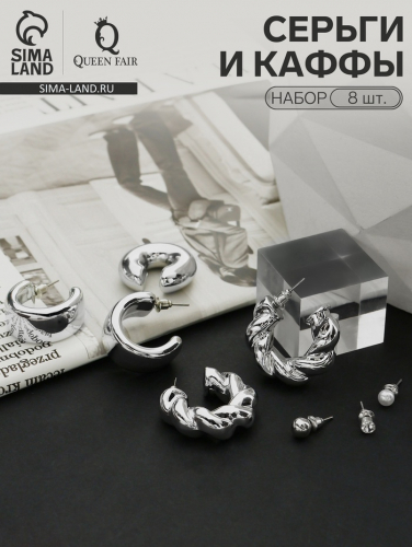 Серьги и кафф QF «Переплетение», набор 8 шт. цвет серебро
