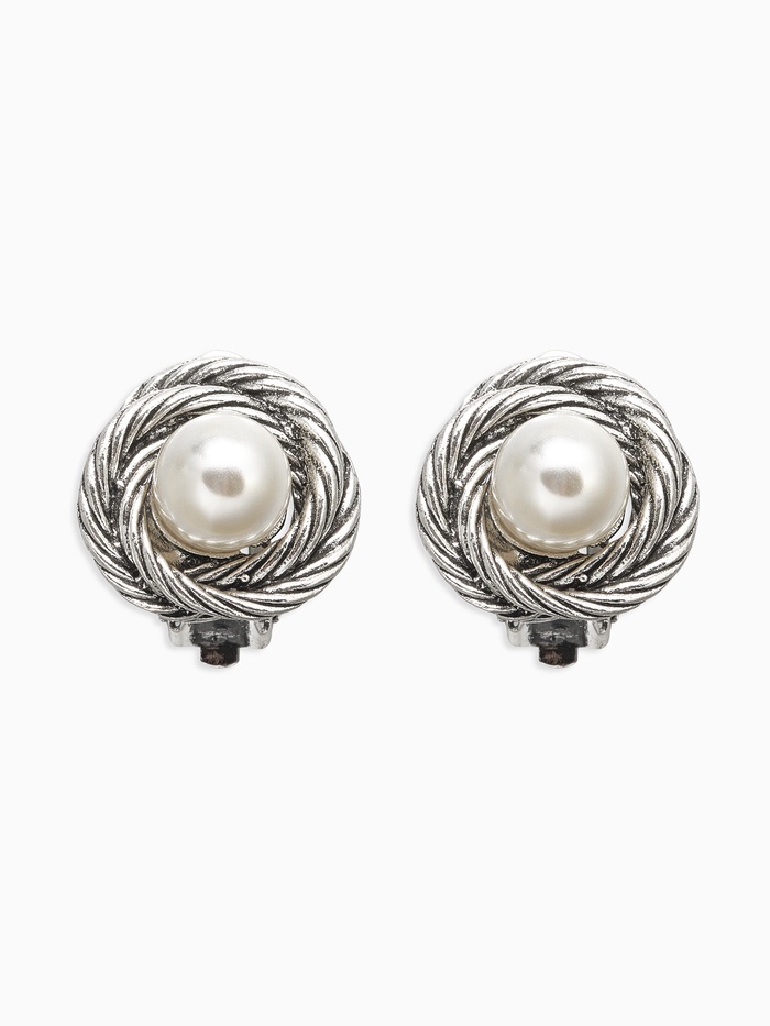 Серьги клипсы для ушей QF «Грейс», закругление с бусиной, белые в чернёном серебре