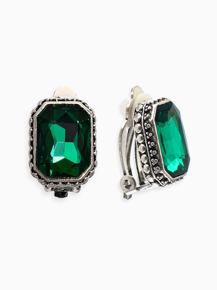 Погрузитесь в чарующую атмосферу винтажного шика с прекрасными изумрудными клипса-ми в форме миниатюрных граней. Гладкая металлическая поверхность покрыта тонким слоем чёрного серебра, подчёркивающим богатую палитру оттенков зелёного стекла.