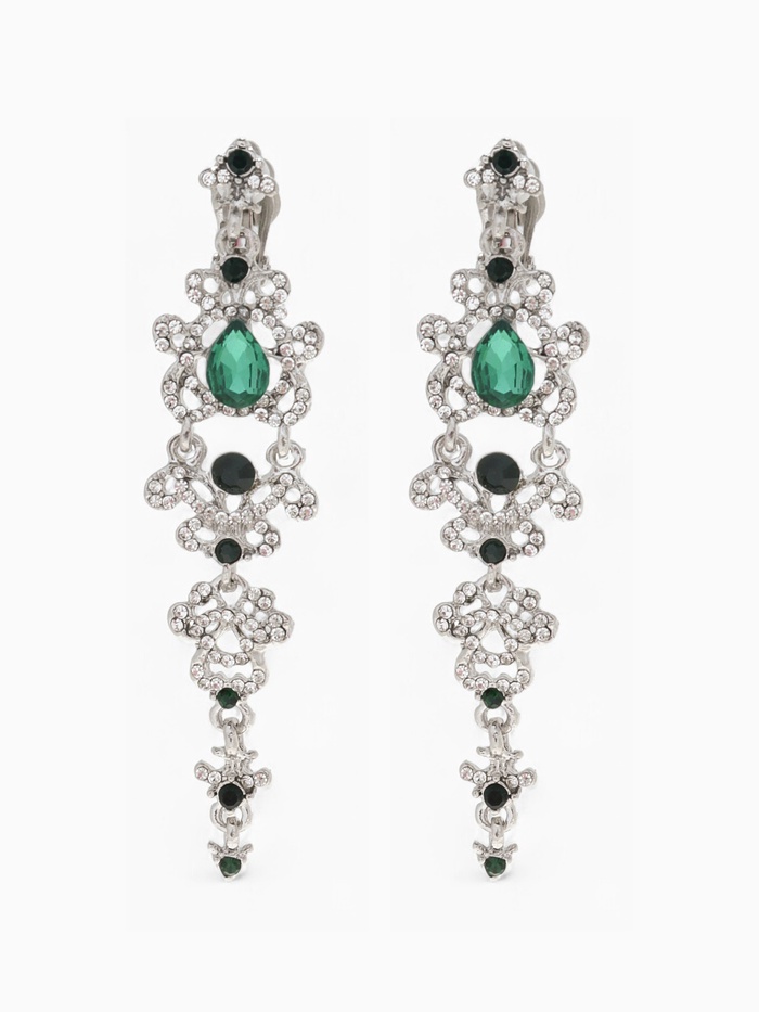 Серьги клипсы для ушей висячие со стразами QF «Ажур», цвет бело-изумрудный в серебре