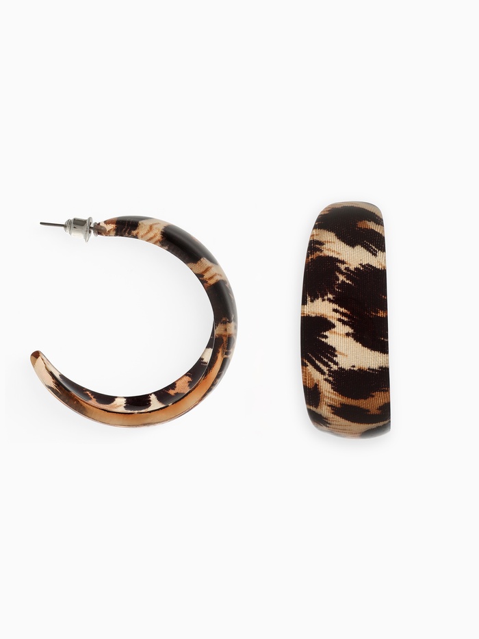 Эти серьги-кольца с мастерски воспроизведённым тёмным леопардовым принтом привносят в образ яркий акцент и свежесть. Диаметр 3,5 см делает их идеально заметными, но при этом удобными для повседневного ношения, создавая гармоничный баланс между выразительностью и практичностью.