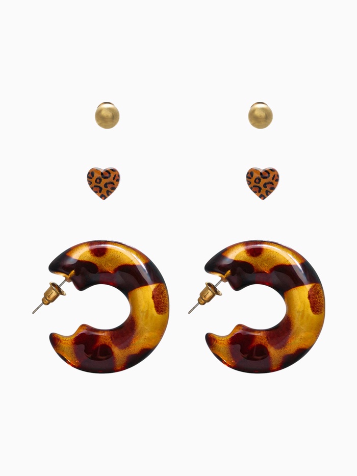 Каждая пара выполнена из качественного металла с золотистой фурнитурой, а вставки из пластика в коричневых тонах придают серьгам характерный «леопардовый» принт. Такой дизайн позволяет сочетать их с различными нарядами, от повседневных до вечерних, придавая вашему стилю особую изюминку.