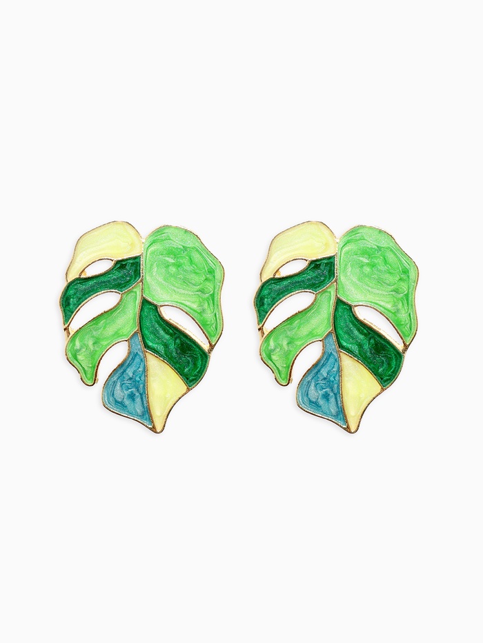 Серьги с эмалью «Листья» монстеры, цвет зелёный в золоте