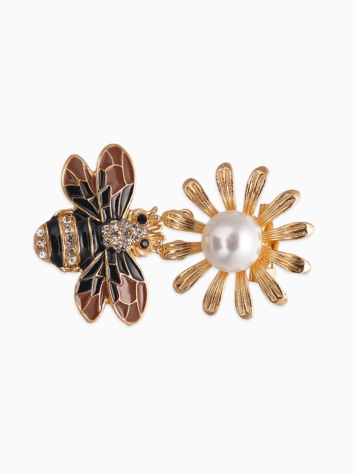 Основная часть изделия выполнена в виде аккуратной пчёлки, расположенной на золотистой подставке, которая кажется вылитой из жидкого металла. Мелкие стразы на спинке насекомого переливаются, привлекая внимание и добавляя финального штриха к вашему облику.