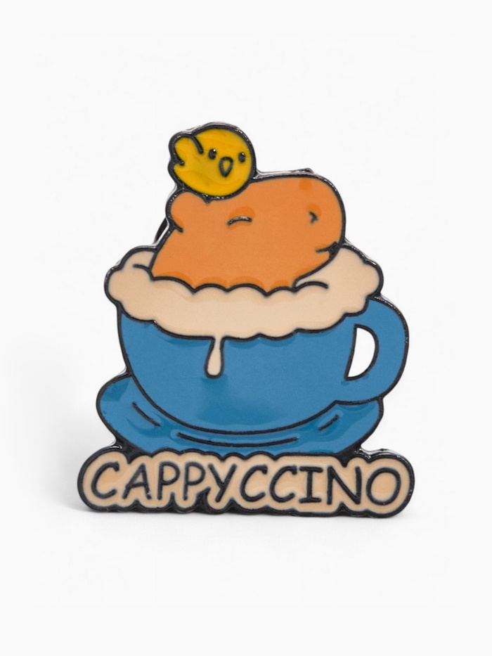Значок «Капибара капучино», оранжево-синий в чёрном металле