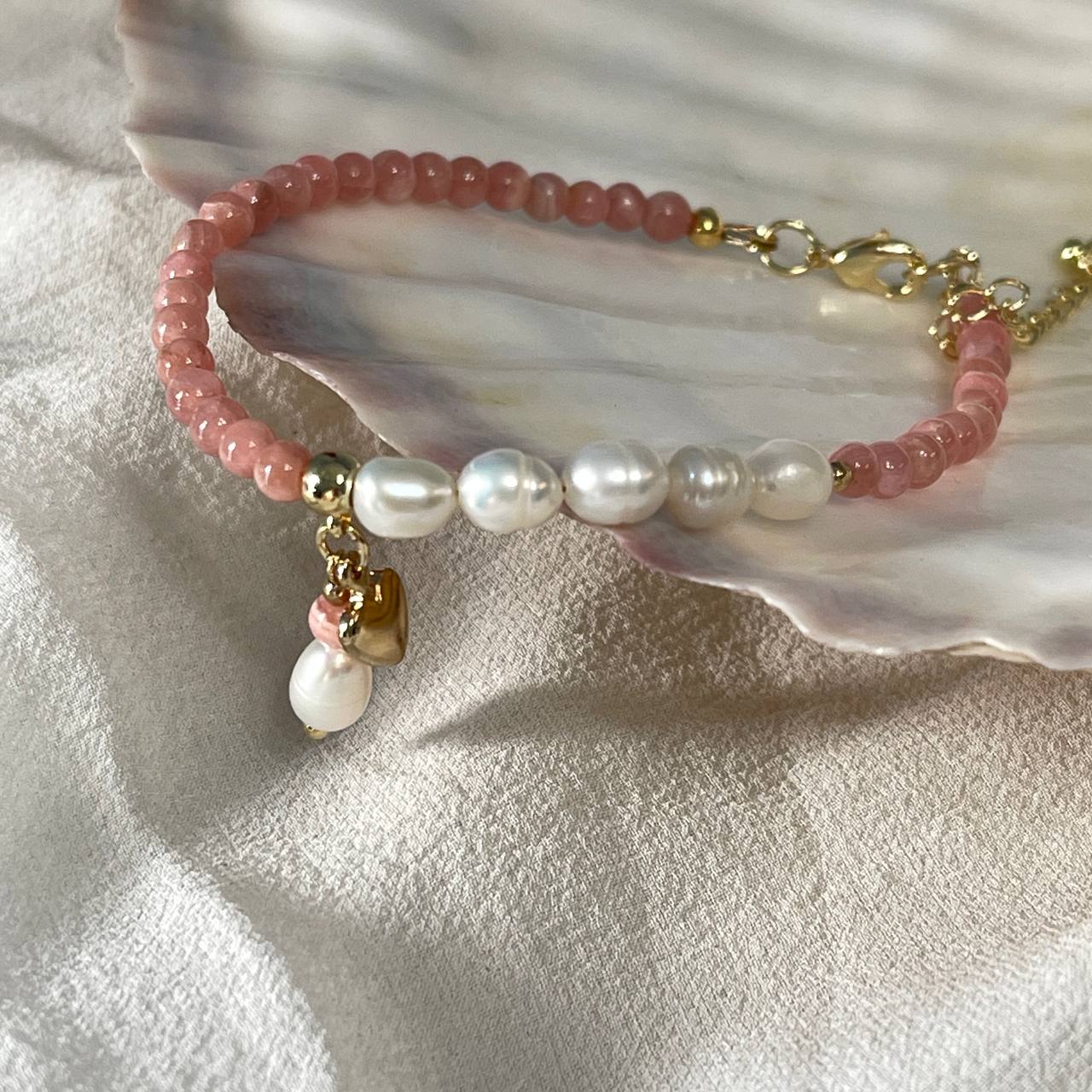 Радуга Самоцветов Браслет из Родохрозита и Жемчуга с подвеской