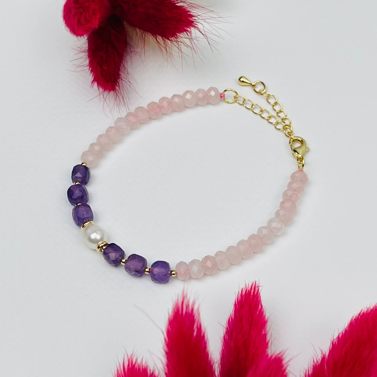 Радуга Самоцветов Браслет из Розового Кварца, Аметиста и Жемчуга