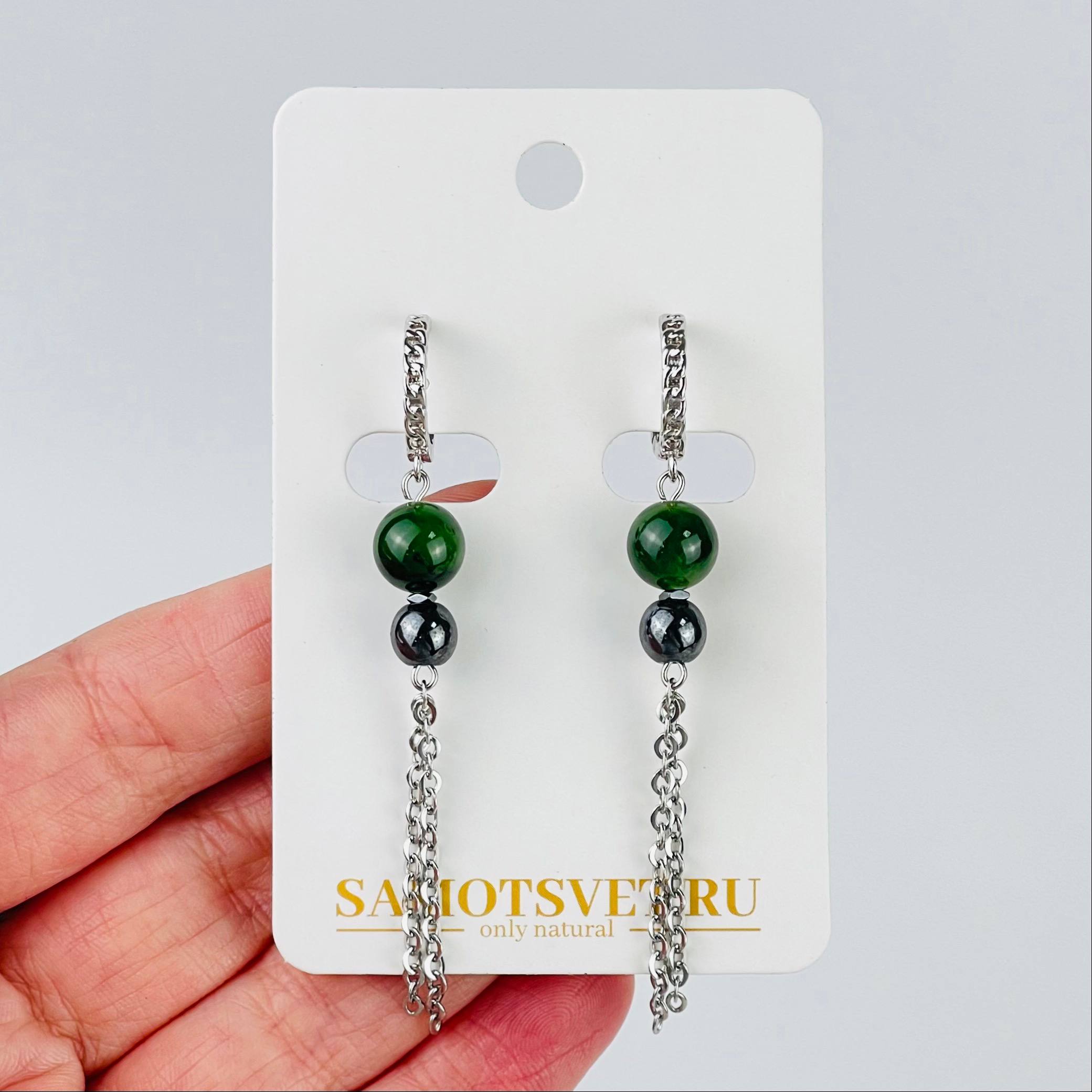 Радуга Самоцветов Серьги длинные из Нефрита и Гематита
