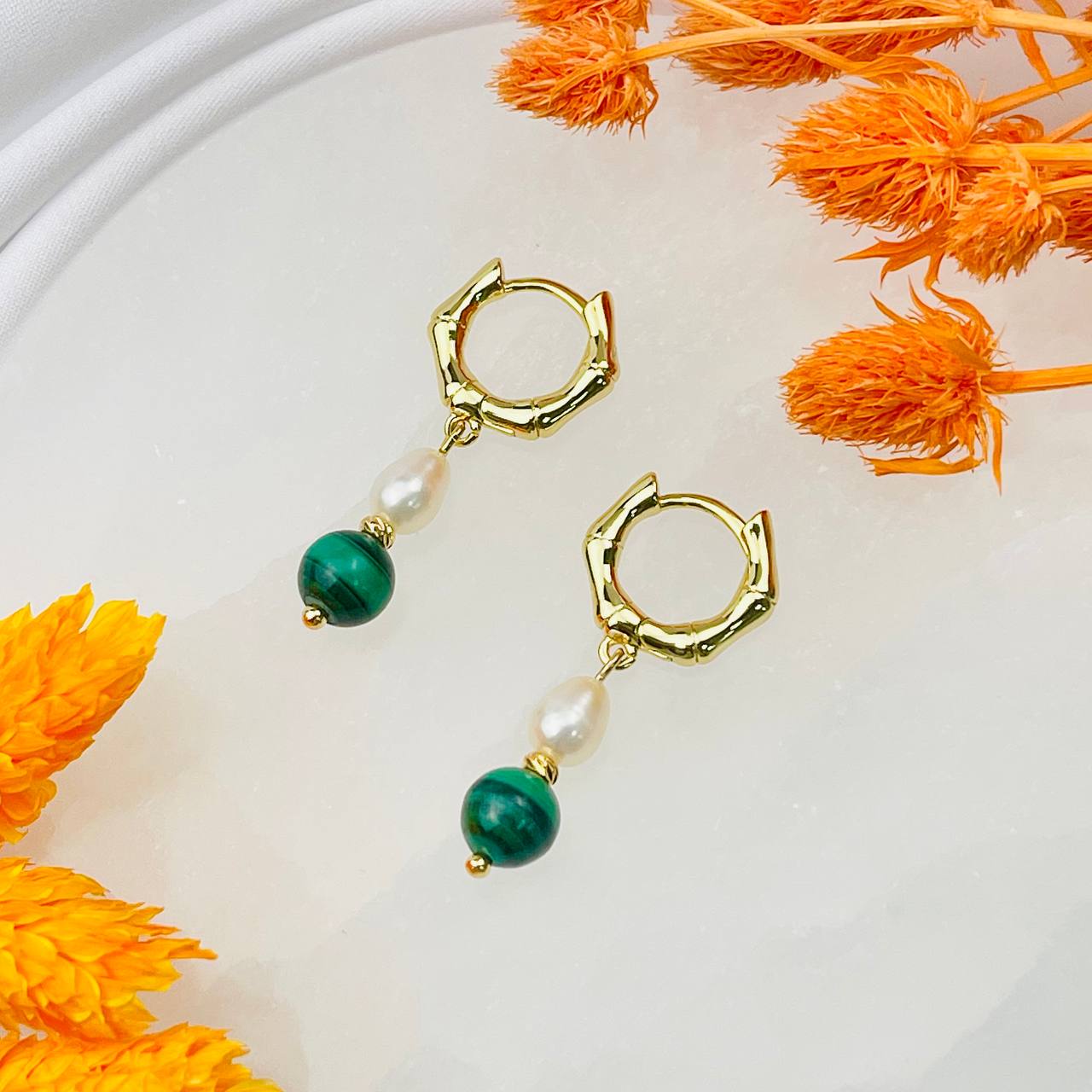 Радуга Самоцветов Серьги двойные из Малахита и Жемчуга