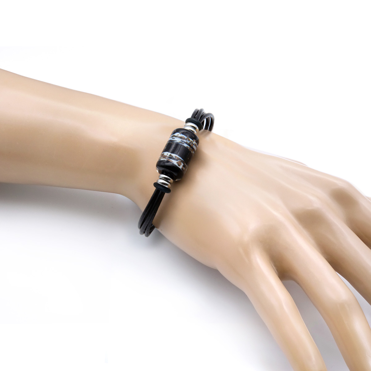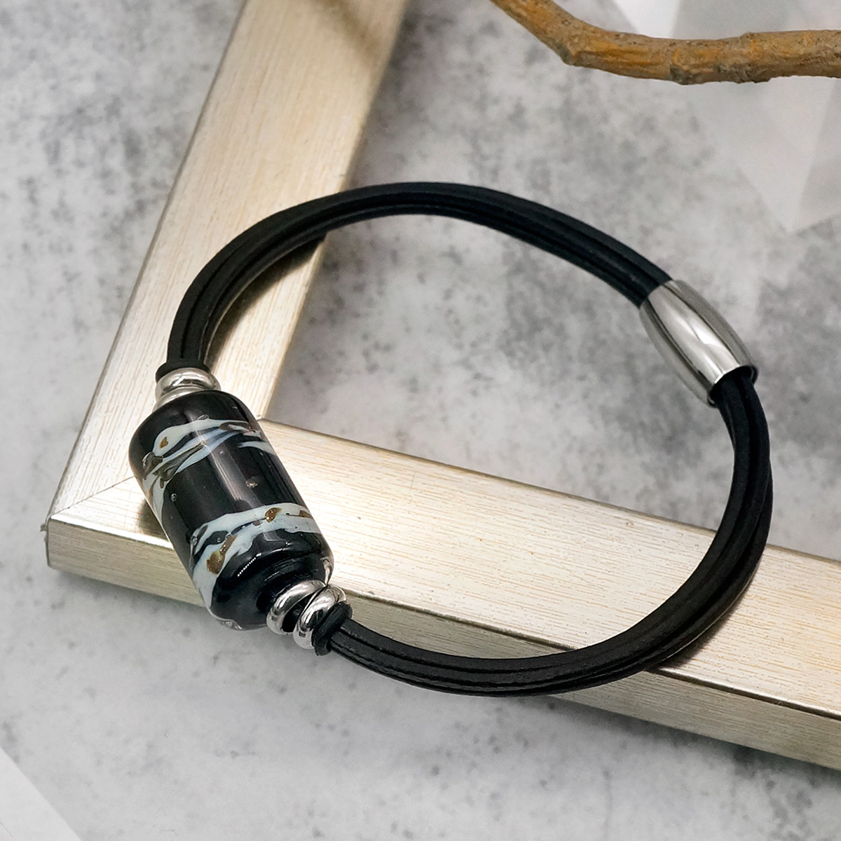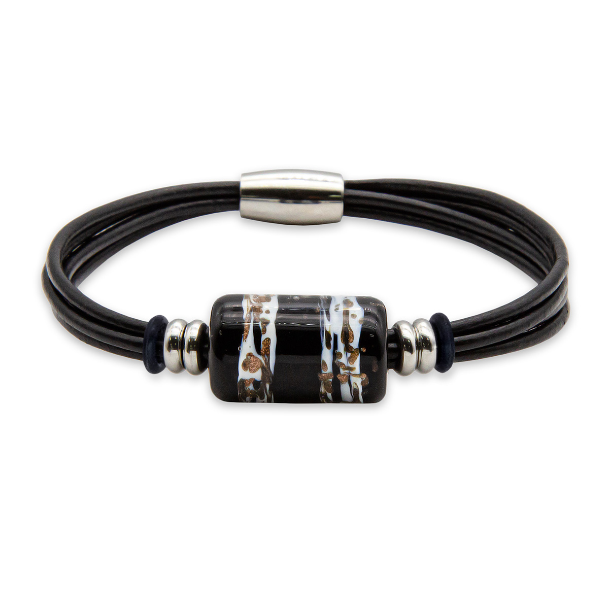 Браслет изготовлен из муранского стекла, натуральной кожи и гипоаллергенной ювелирной стали, что очень важно для людей с чувствительной кожей. Металл не темнеет и не подвергается воздействиям окружающей среды, надолго обеспечивая красивый внешний вид изделия. Крепкий магнитный замок с двойной защитой надежно фиксируется на запястье. Ширина браслета - 0,5 см. Размер стеклянной бусины - 1,3x2,2 см. Вес - 12 гр.
