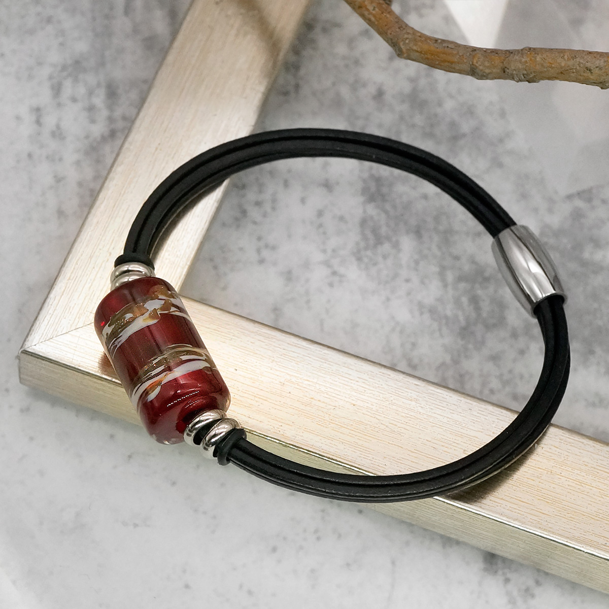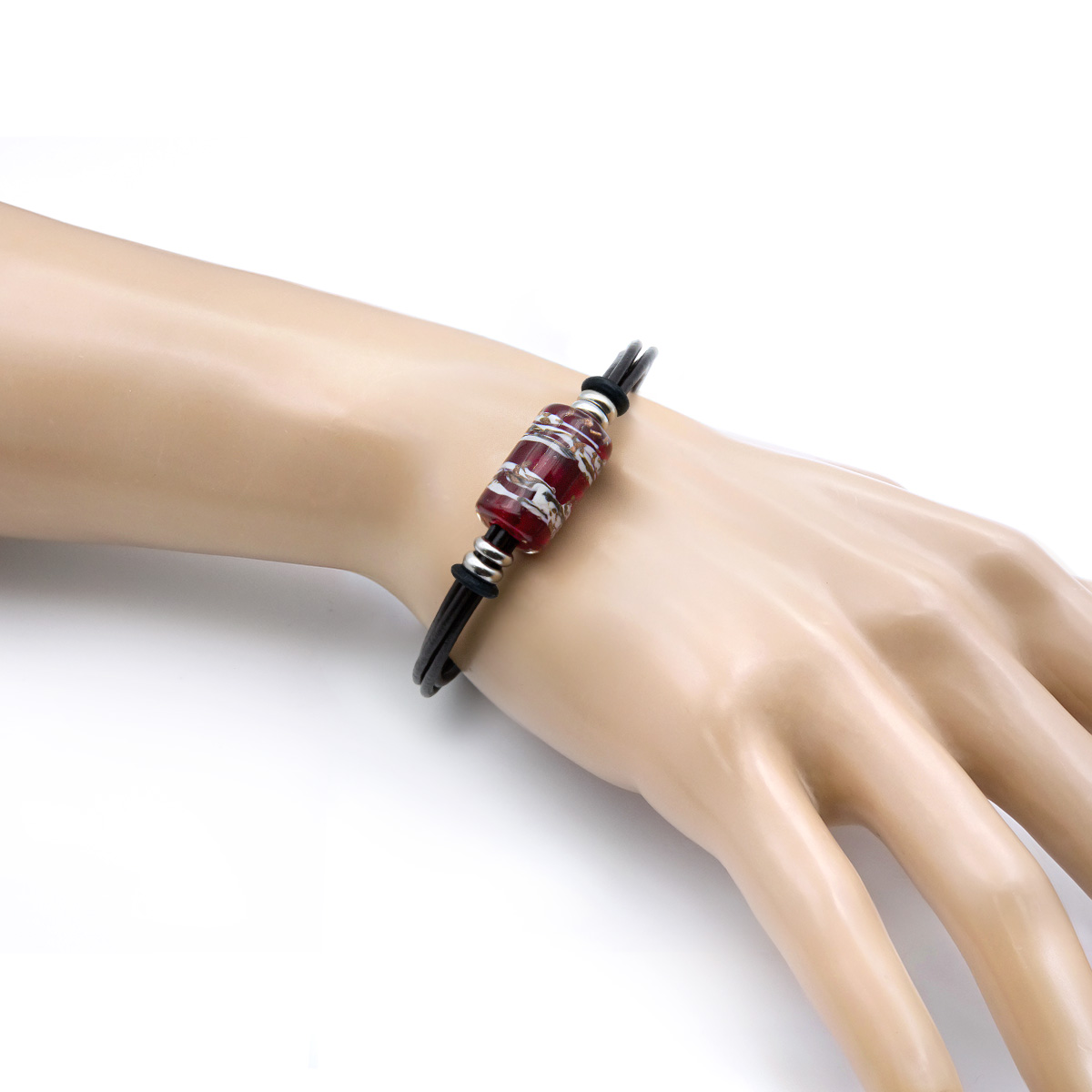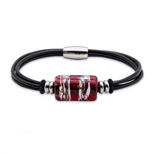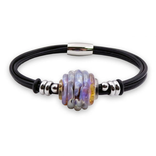 Браслет изготовлен из муранского стекла, натуральной кожи и гипоаллергенной ювелирной стали, что очень важно для людей с чувствительной кожей. Металл не темнеет и не подвергается воздействиям окружающей среды, надолго обеспечивая красивый внешний вид изделия. Крепкий магнитный замок с двойной защитой надежно фиксируется на запястье. Ширина браслета - 0,5 см. Размер стеклянной бусины - 1,3x2,2 см. Вес - 12 гр.