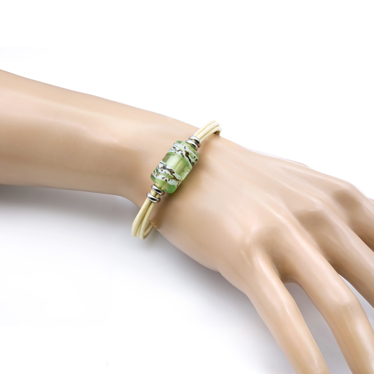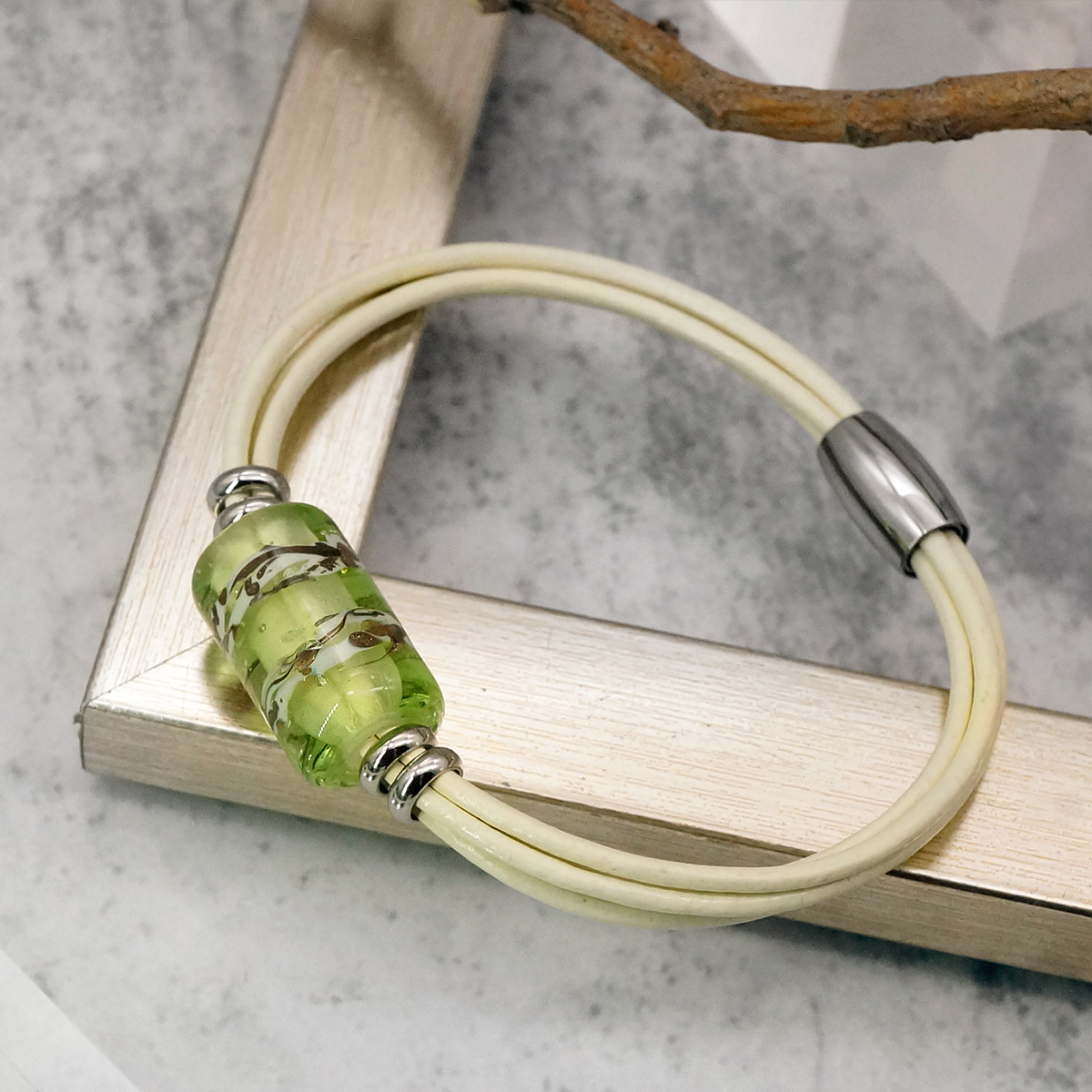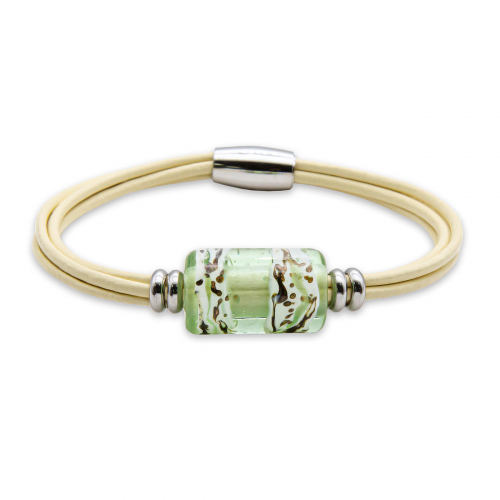 Браслет изготовлен из муранского стекла, натуральной кожи и гипоаллергенной ювелирной стали, что очень важно для людей с чувствительной кожей. Металл не темнеет и не подвергается воздействиям окружающей среды, надолго обеспечивая красивый внешний вид изделия. Крепкий магнитный замок с двойной защитой надежно фиксируется на запястье. Ширина браслета - 0,5 см. Размер стеклянной бусины - 1,3x2,2 см. Вес - 12 гр.