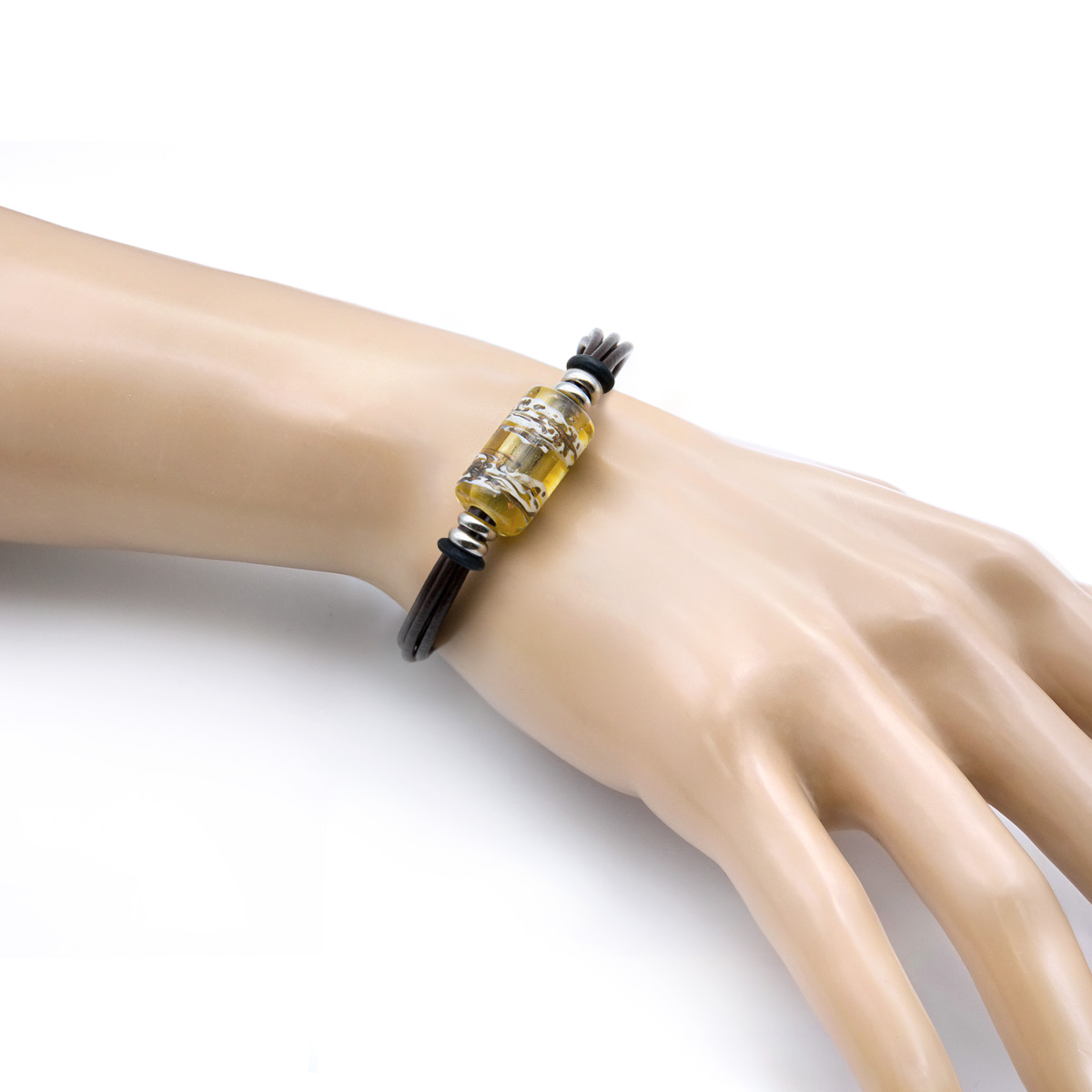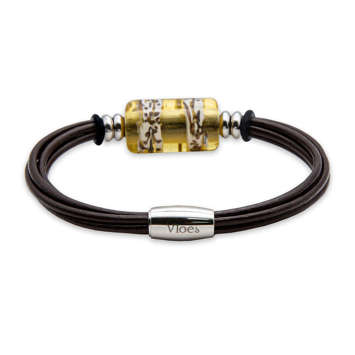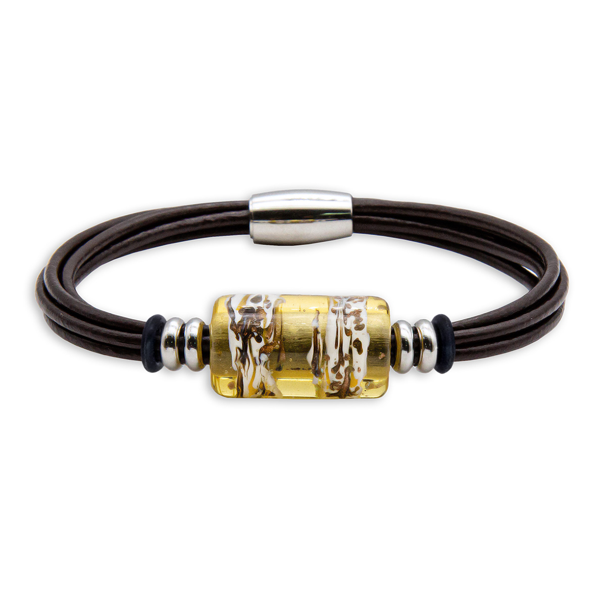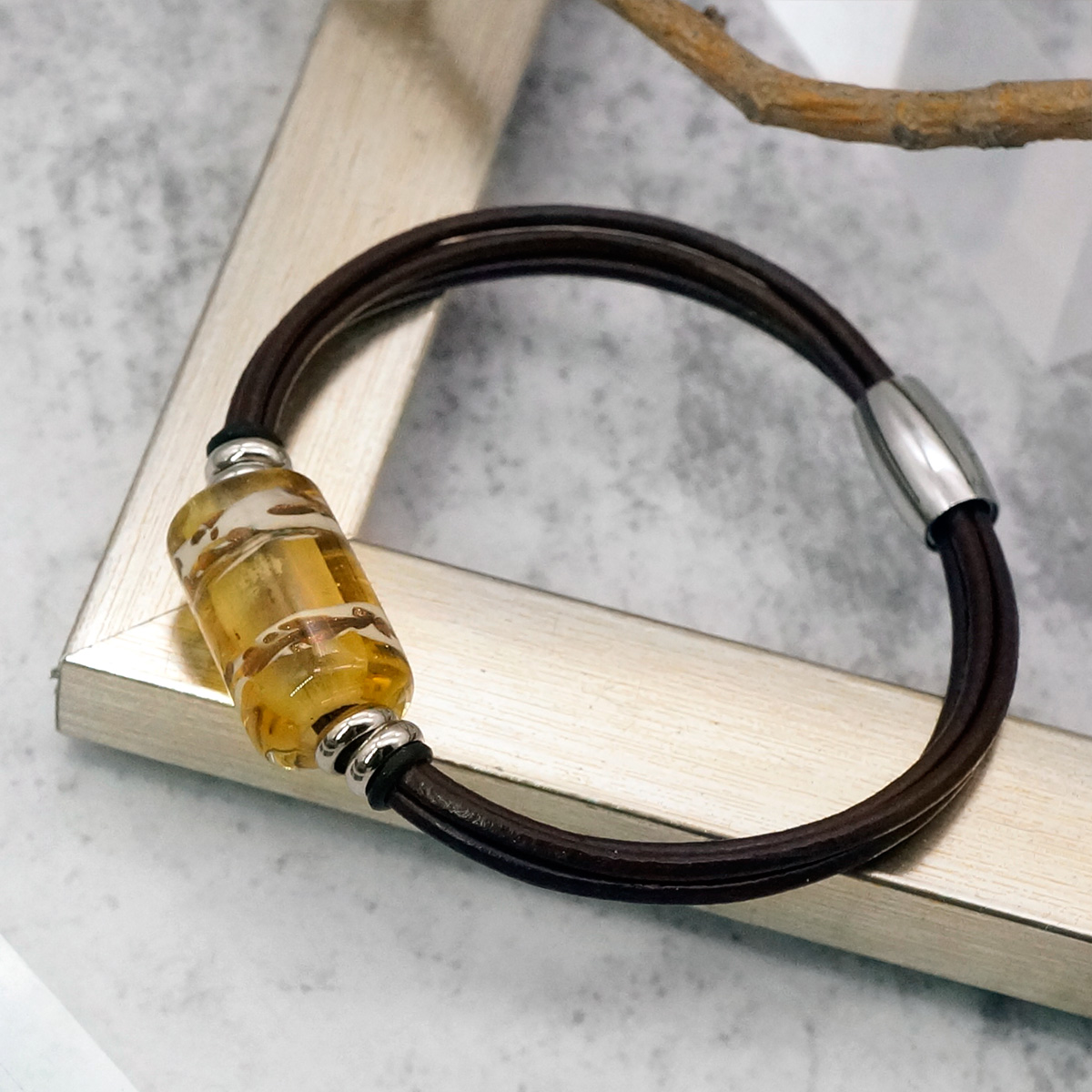 Браслет изготовлен из муранского стекла, натуральной кожи и гипоаллергенной ювелирной стали, что очень важно для людей с чувствительной кожей. Металл не темнеет и не подвергается воздействиям окружающей среды, надолго обеспечивая красивый внешний вид изделия. Крепкий магнитный замок с двойной защитой надежно фиксируется на запястье. Ширина браслета - 0,5 см. Размер стеклянной бусины - 1,3x2,2 см. Вес - 12 гр.
